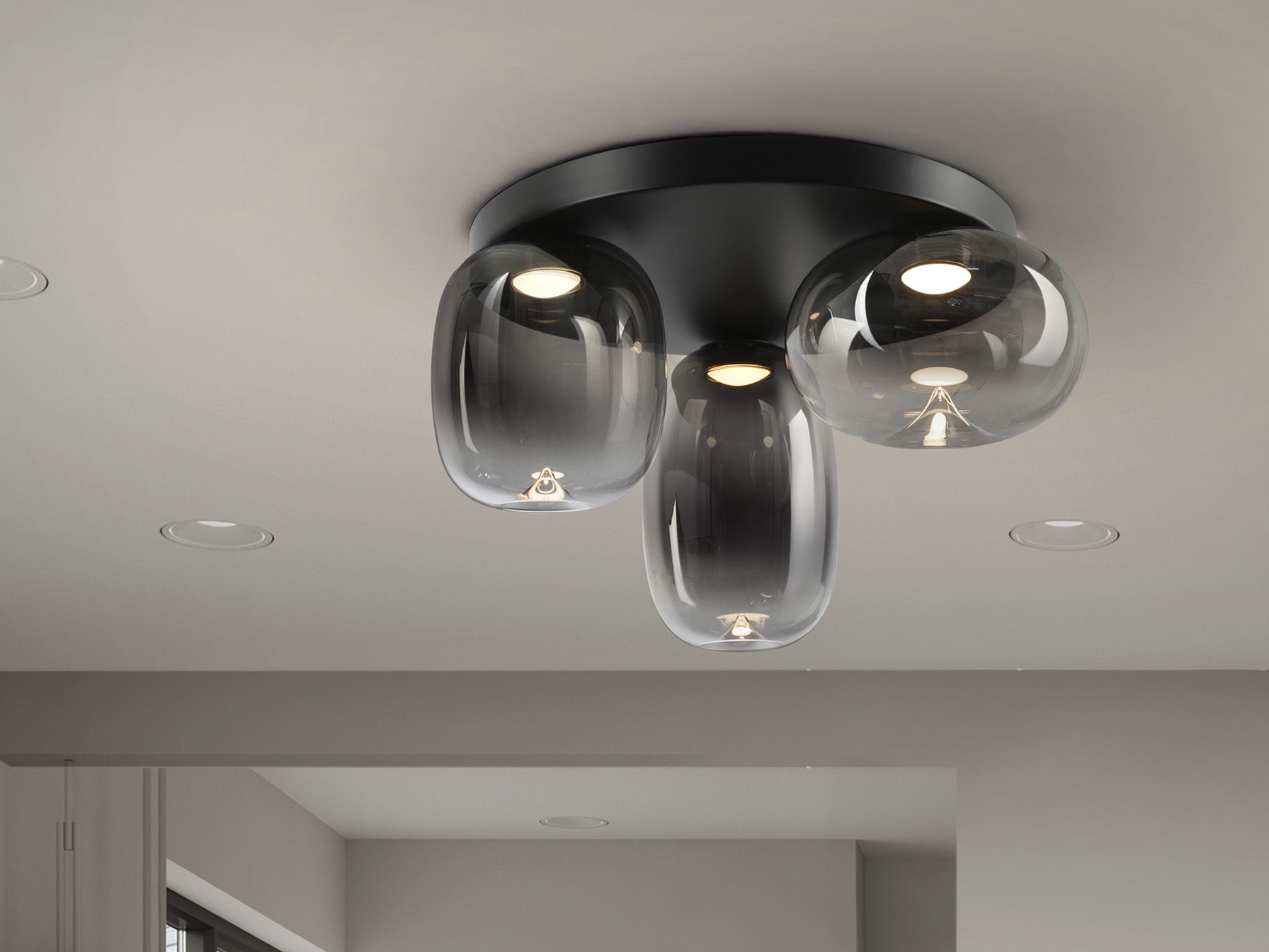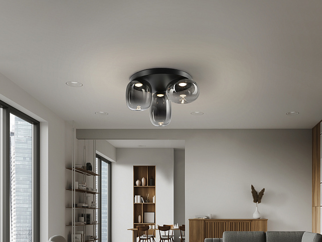 Потолочный светильник на 3 лампы из металла с матово-черной отделкой. Абажуры из дутого стекла с размытой дымчато-серой отделкой, переходящей в прозрачную. Регулируемая высота. Светодиод 18 Вт, 1000 лм, 3000 К. · Эта лампа оснащена ГРАВИТАЦИОННЫМИ ПЕРЕКЛЮЧАТЕЛЯМИ для улучшения фиксации на потолке. Доступна версия на 110 В.