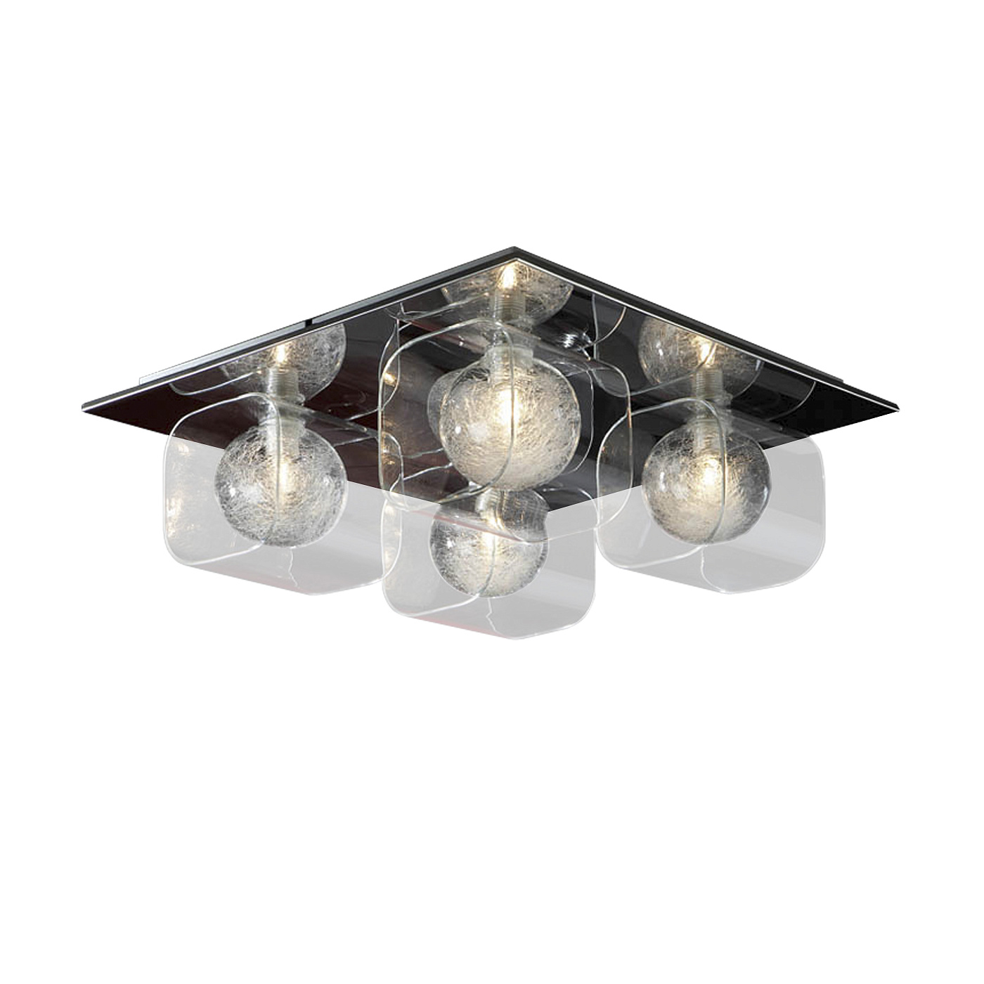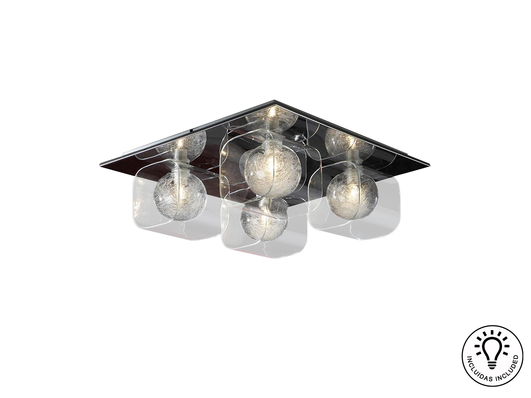 Потолочный светильник из металла с 4 лампами, блестящее хромированное покрытие, плафоны из прессованного стекла с внутренним шаром, украшенным стекловолокном. Включает 4 светодиода G9 мощностью 6 Вт.