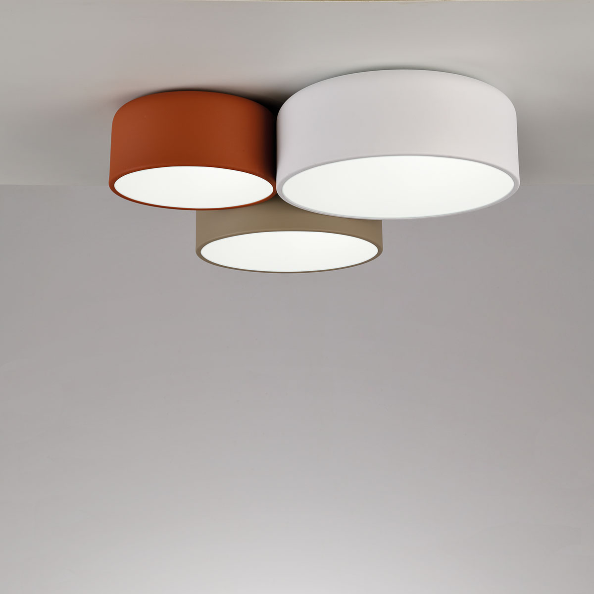Потолочный светильник, состоящий из 3 металлических абажуров разных размеров и цветов.