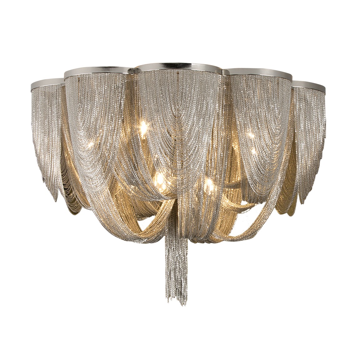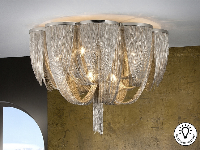 Потолочный светильник с 10 лампами, образован тонкими металлическими цепями с покрытием "никель". Включает 10 светодиодов G9 мощностью 6 Вт.
