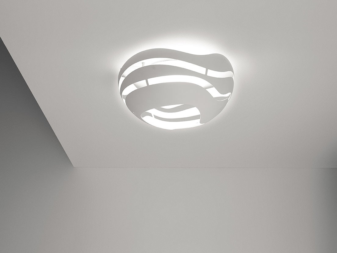 Органический эстетичный потолочный светильник с алюминиевым экраном. Прямой и отраженный свет. Доступен в двухцветном текстурированном матовом черном или белом одноцветном исполнении, а также в текстурированном матовом черном или белом двухцветном исполнении с золотым интерьером.