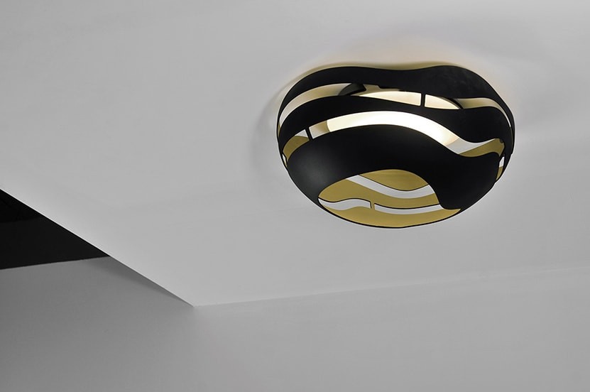 Органический эстетичный потолочный светильник с алюминиевым экраном. Прямой и отраженный свет. Доступен в двухцветном текстурированном матовом черном или белом одноцветном исполнении, а также в текстурированном матовом черном или белом двухцветном исполнении с золотым интерьером.