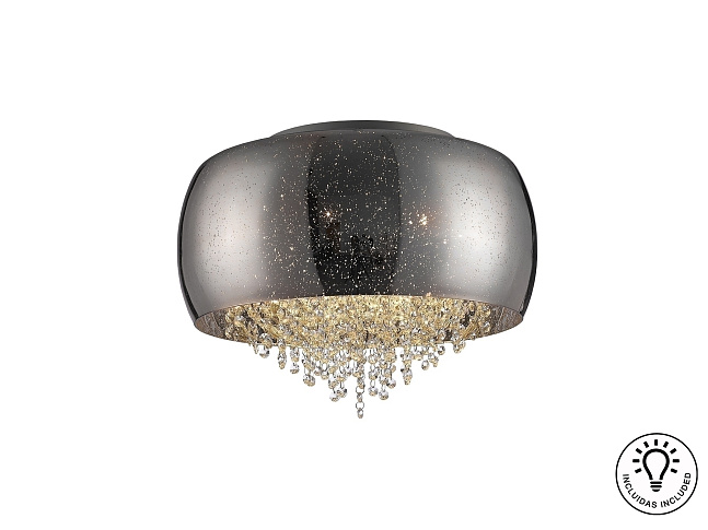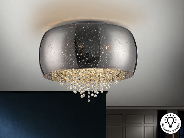 Потолочный светильник из металла с покрытием "хром". Плафон из зеркального дутого стекла серебристого цвета с декоративным рисунком "звёздная пыль", внутри подвески из гранёного стекла. Включает 6 светодиодов G9 мощностью 6 Вт.