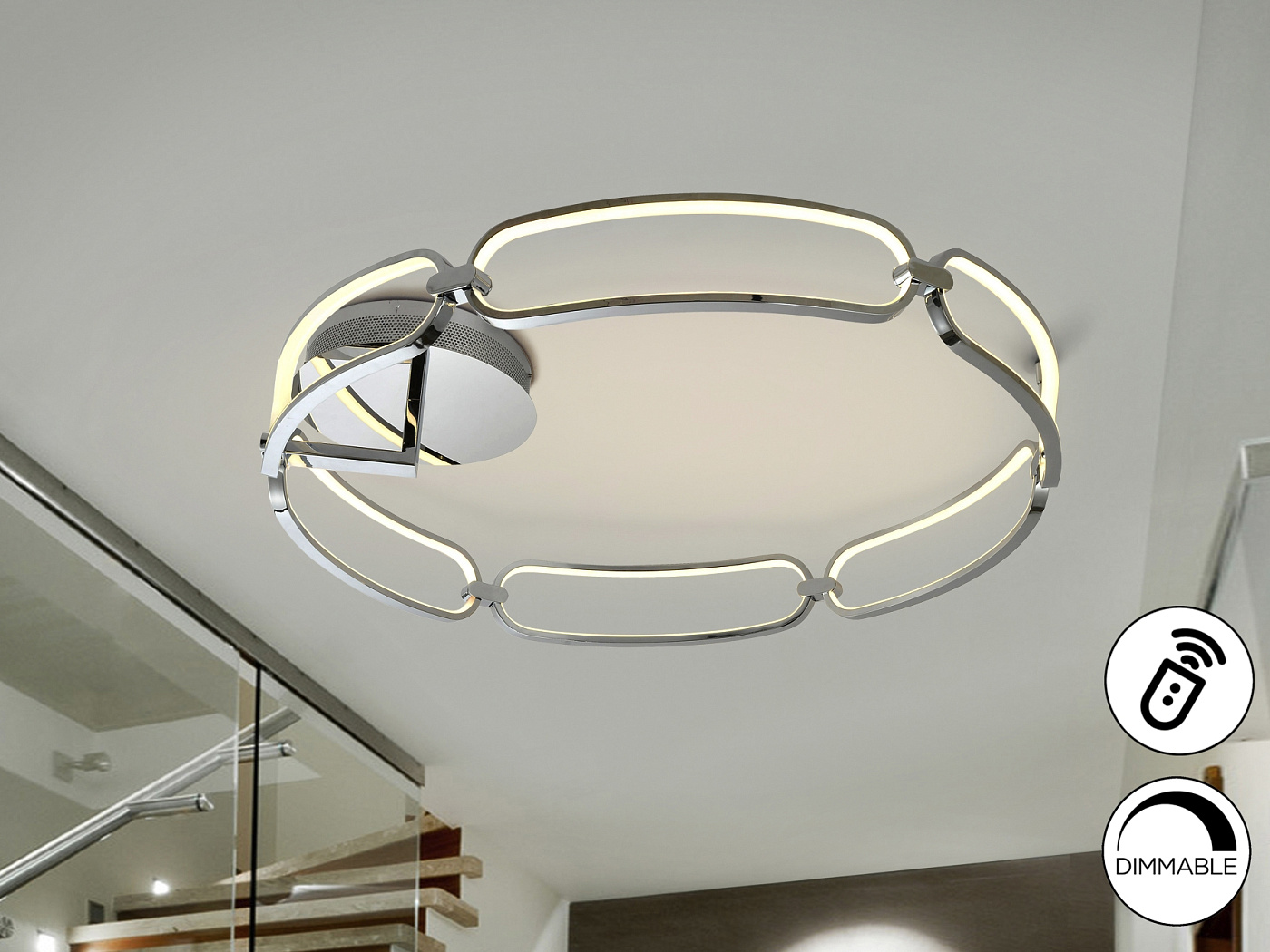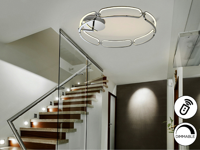 Большой светодиодный потолочный светильник из алюминия с хромированной отделкой. Опаловые силиконовые диффузоры. Светодиод 65 Вт, 5,850 лм, 3,000 К. С возможностью затемнения. Включает пульт дистанционного управления. Этот продукт включает драйверы светодиодов с диммером 0-10 В или ШИМ, приемник и радиочастотный пульт дистанционного управления. Для использования с настенным регулятором используйте только диммеры этих двух типов регулирования. Диммер другого типа может повредить драйвер светодиода.