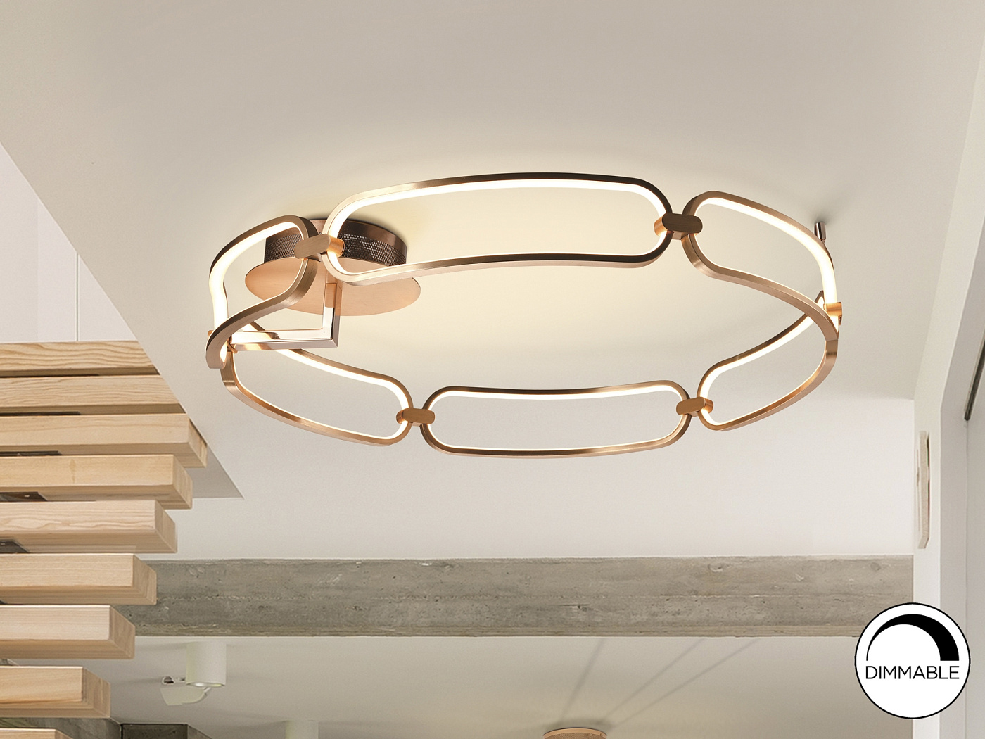 Потолочный светильник LED большого размера, из алюминия с матовым полированным золотистым покрытием. Силиконовые рассеиватели опалового цвета, 65W LED, 5850 Lm, 3000 K.