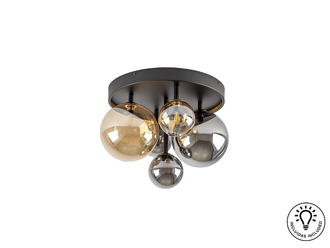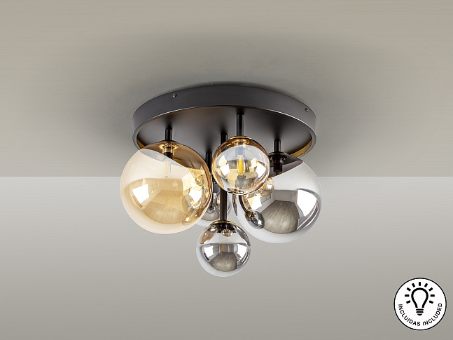 Потолочный светильник на 5 ламп из металла с матовой черной отделкой и деталями из сатинированной латуни. Сферические стеклянные плафоны диаметром 12 и 20 см в янтарном и зеркальном дымчато-сером исполнении. ·Этот товар включает в себя 5 светодиодов G9 4 Вт.