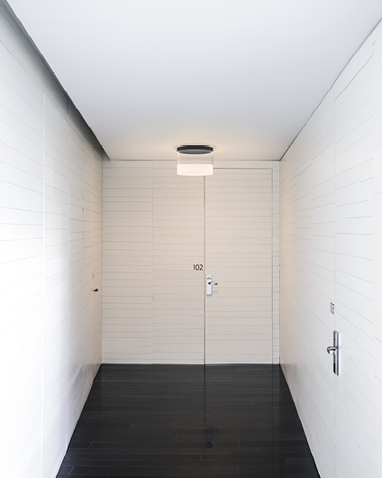 Потолочный светильник. Стеклянный цилиндр большего диаметра удерживается вертикально, концентрируя свет в нижней короне света. Вытравленный на боросиликатном стекле рисунок штрихов излучает общий свет с муаровым эффектом визуальной интерференции, увенчанным тонким ореолом. Источник света скрыт верхним черным профилем.