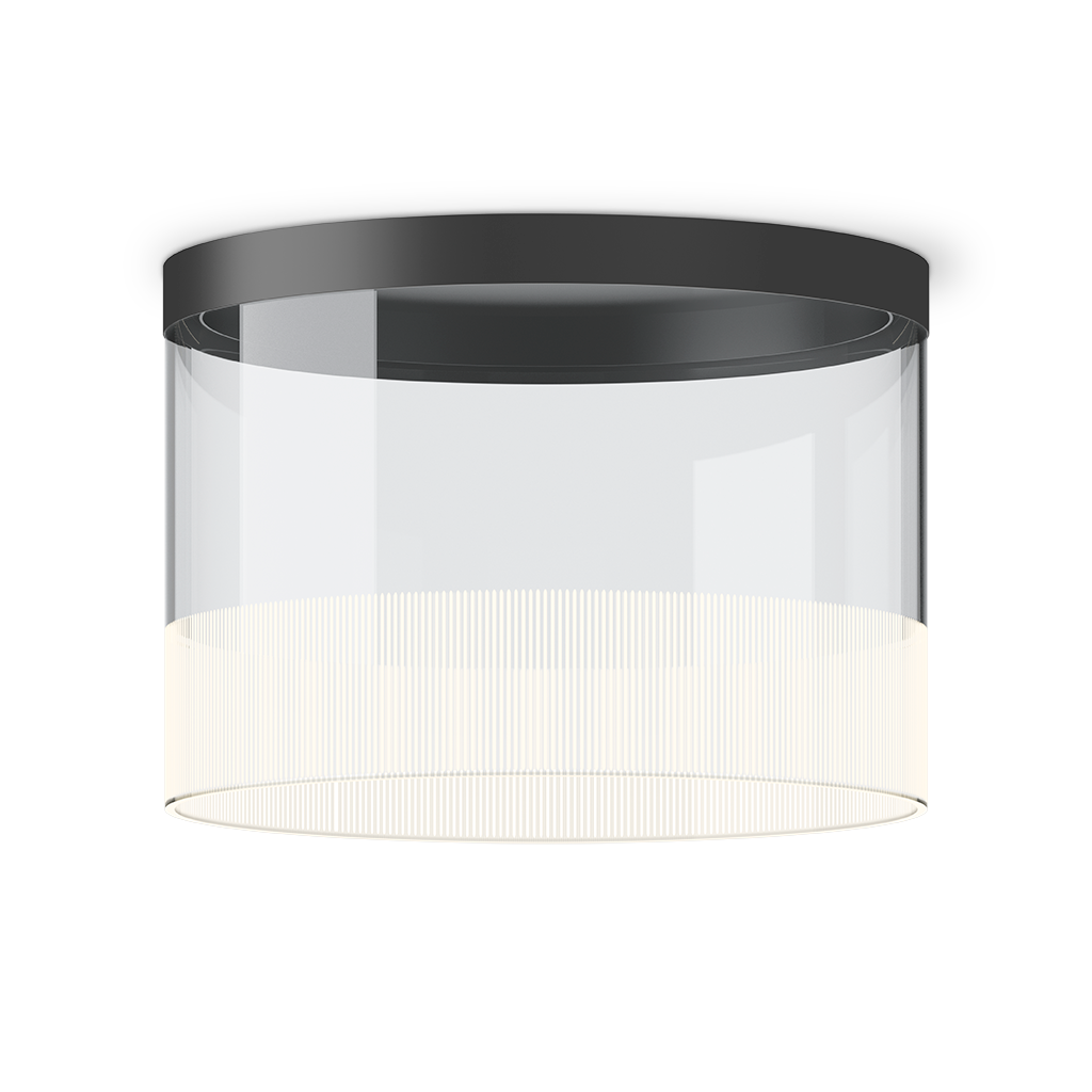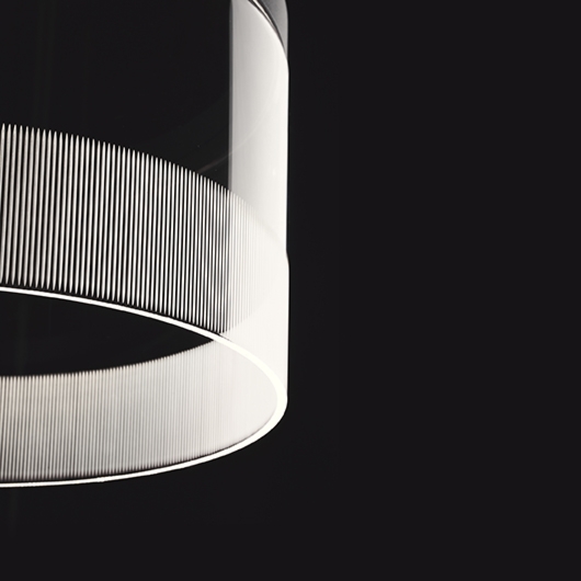 Потолочный светильник. Стеклянный цилиндр большего диаметра удерживается вертикально, концентрируя свет в нижней короне света. Вытравленный на боросиликатном стекле рисунок штрихов излучает общий свет с муаровым эффектом визуальной интерференции, увенчанным тонким ореолом. Источник света скрыт верхним черным профилем.