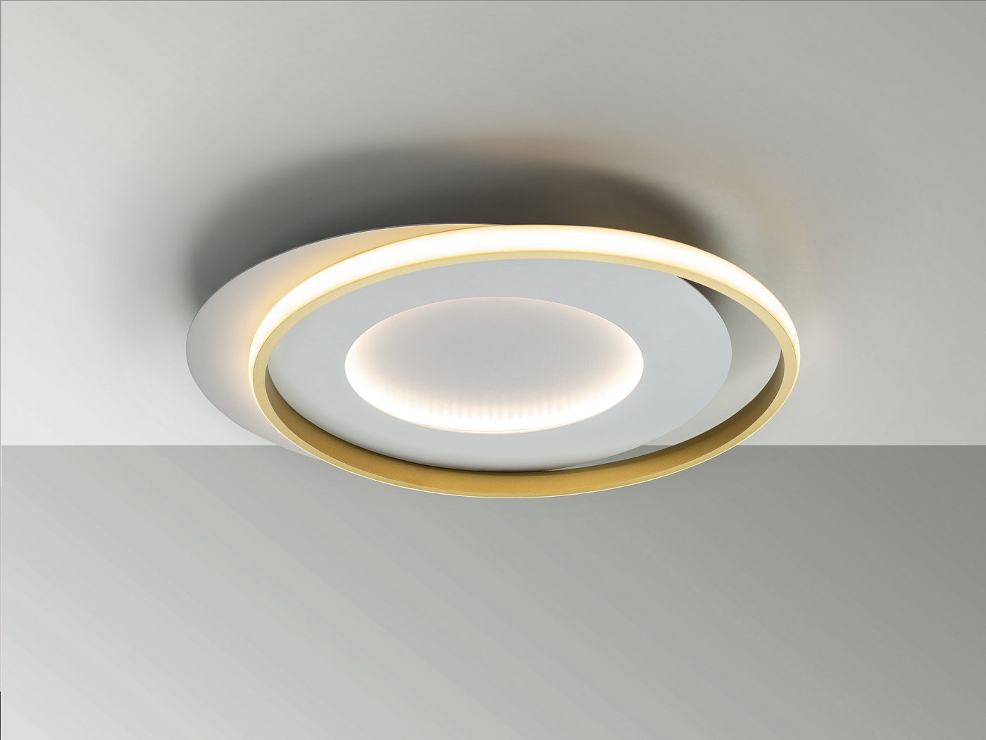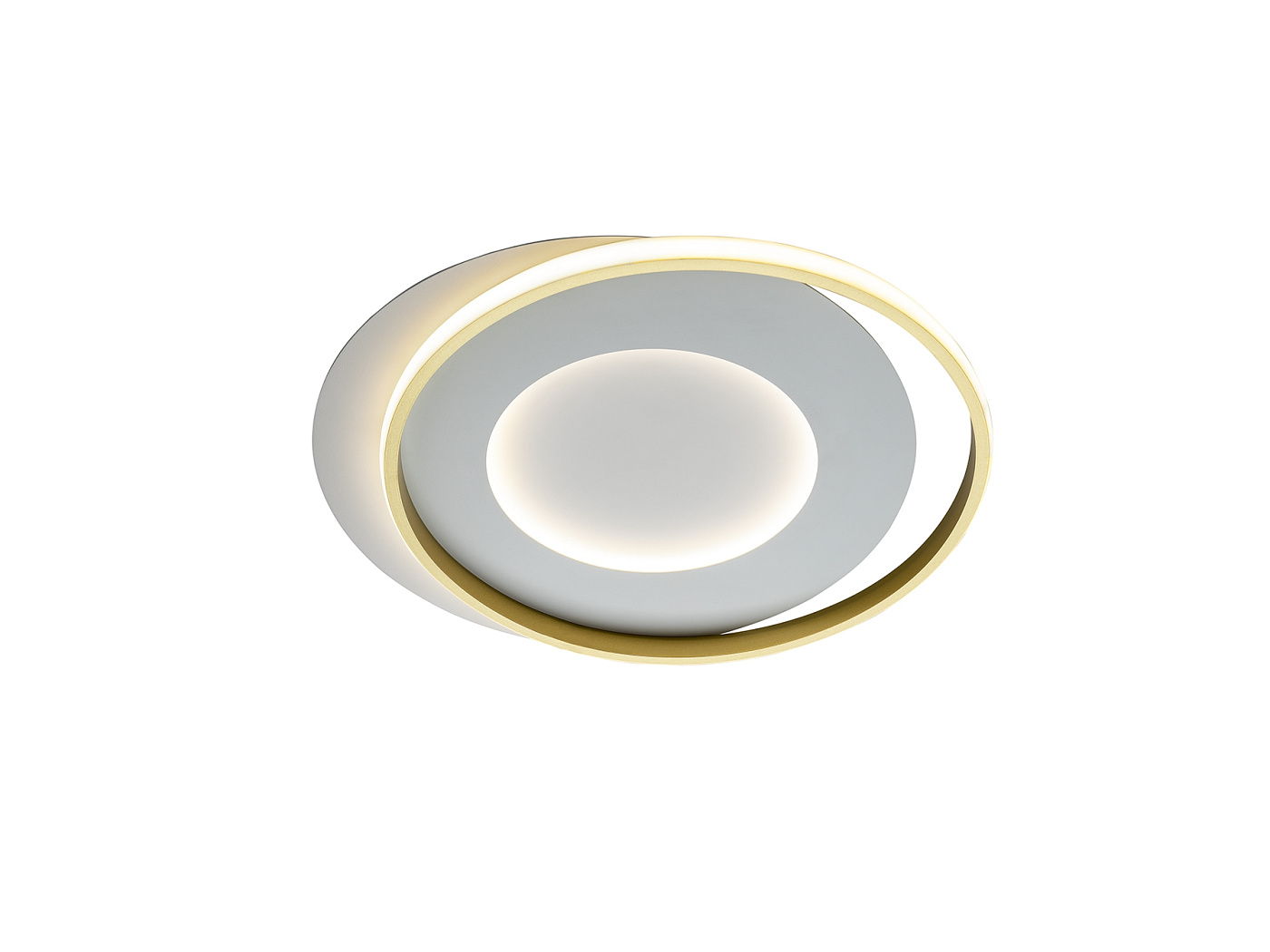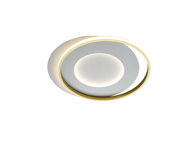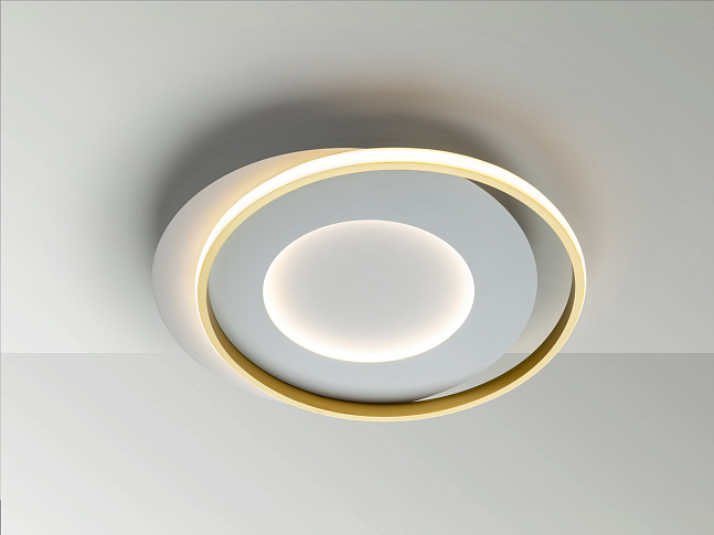 Потолочный светильник из металла и алюминия с матовой белой и золотой отделкой. Опаловый силиконовый рассеиватель. Светодиод 40Вт. 4400 лм. 3000 К.