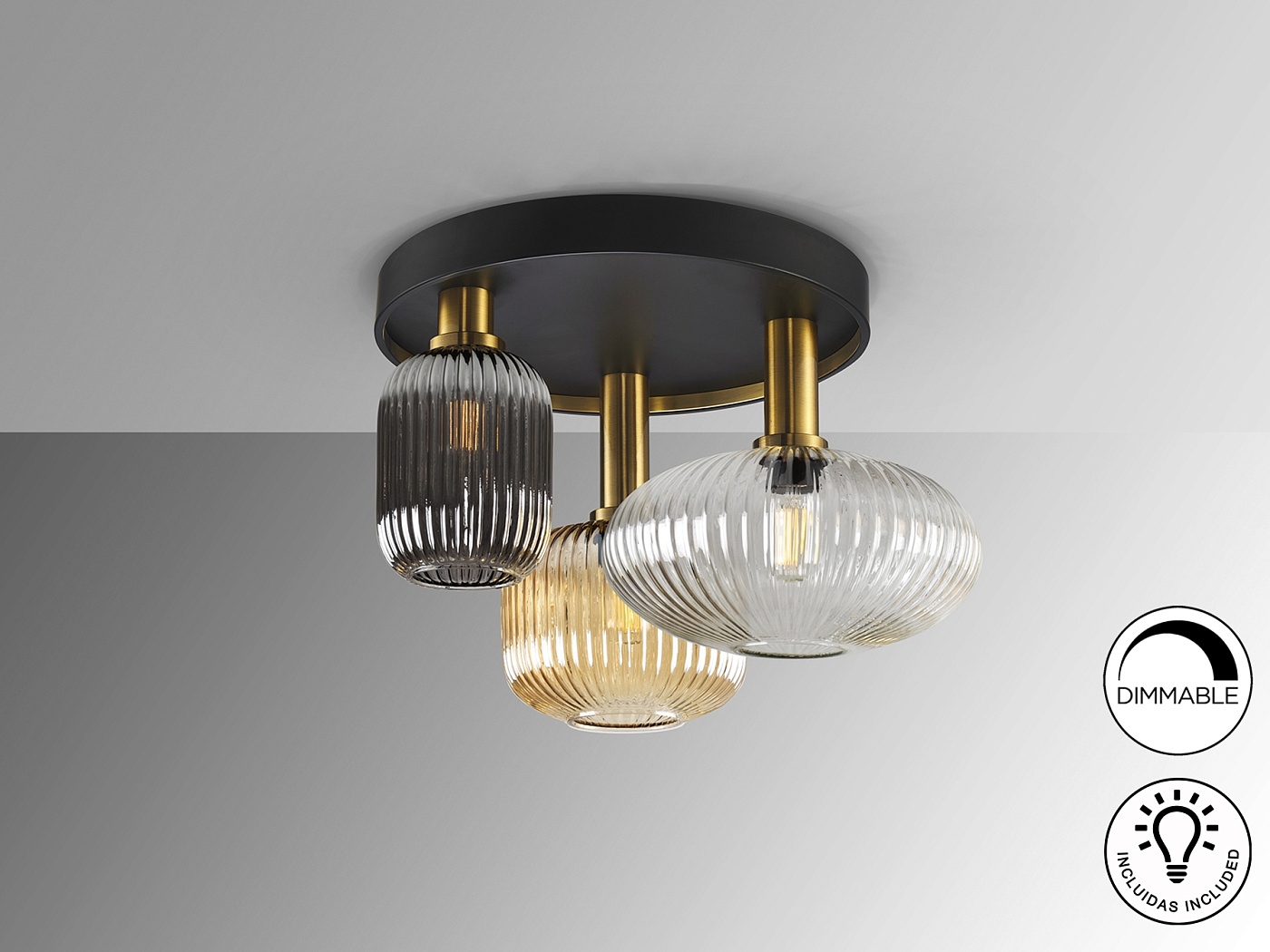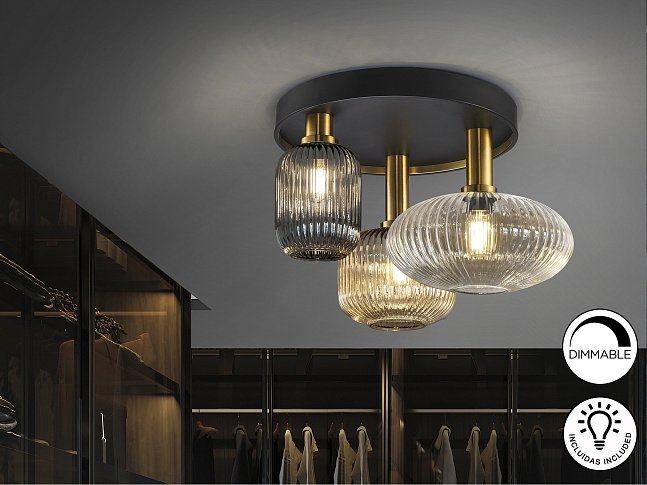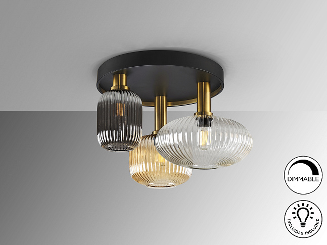 Потолочный светильник с 3 лампами из металла, окрашенного в черный матовый цвет, с деталями из сатинированной латуни. Абажуры из формованного стекла прозрачного, янтарного и мерцающего дымчато-серого цвета.