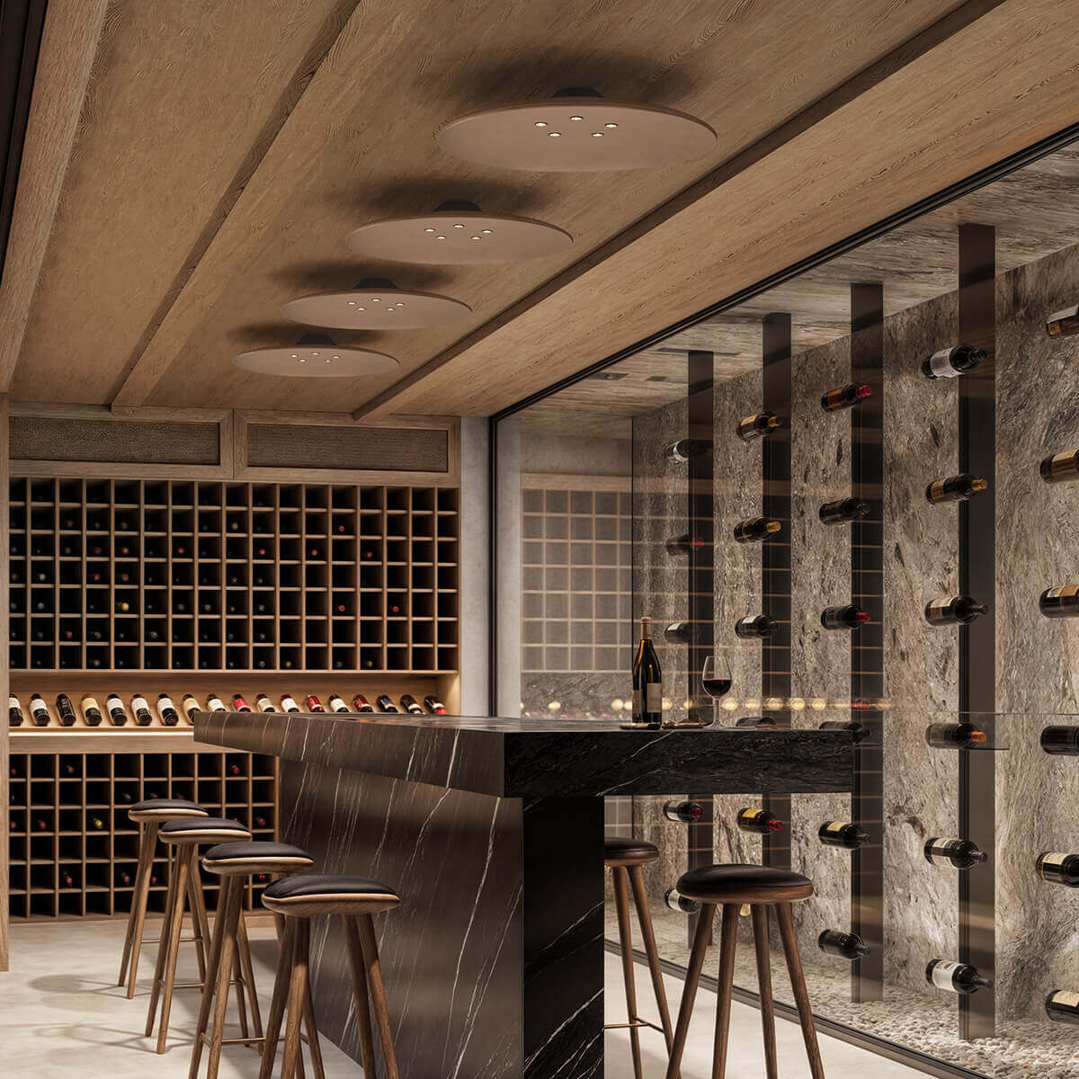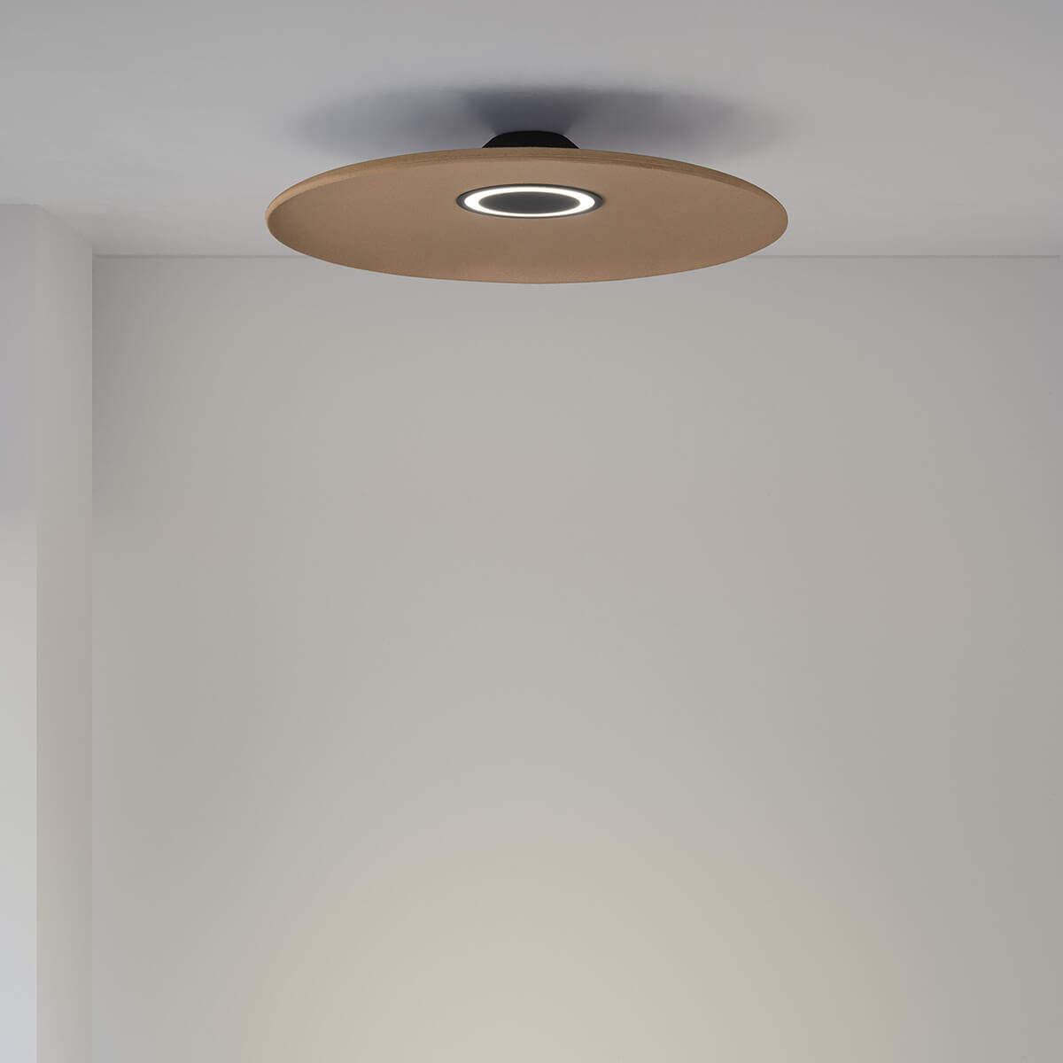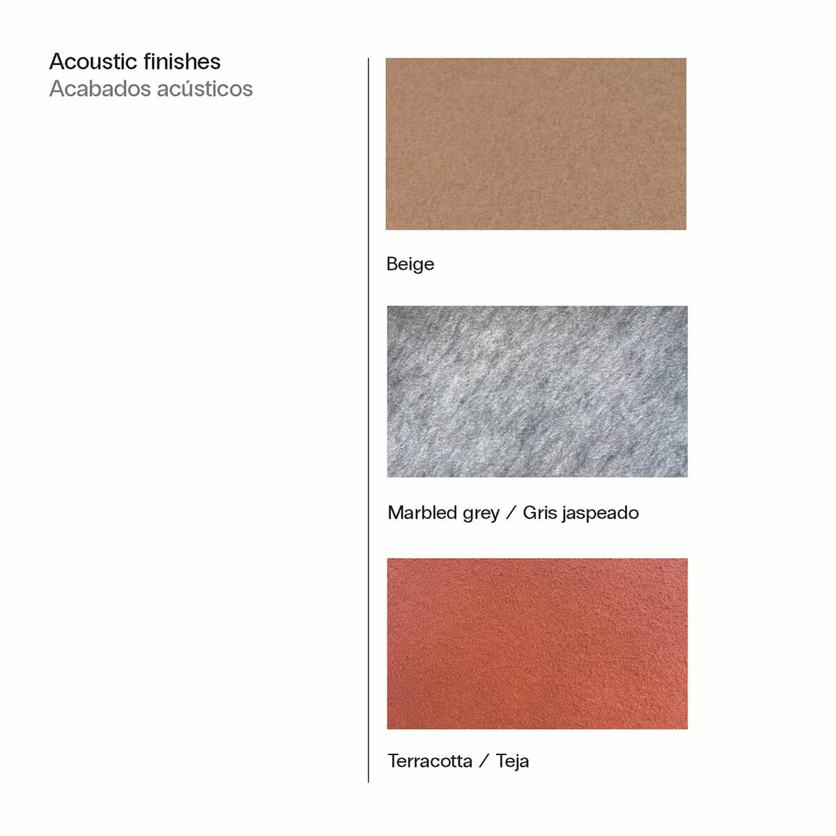 Потолочный светильник с акустической панелью и светодиодным кольцом PCB. Доступен в 3 различных цветах: мраморно-серый, бежевый и терракотовый.