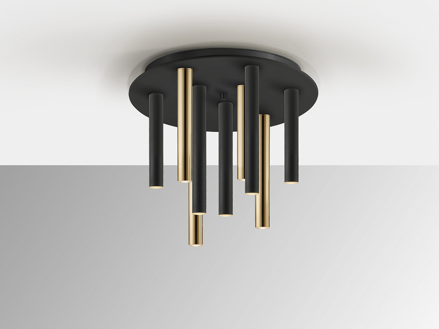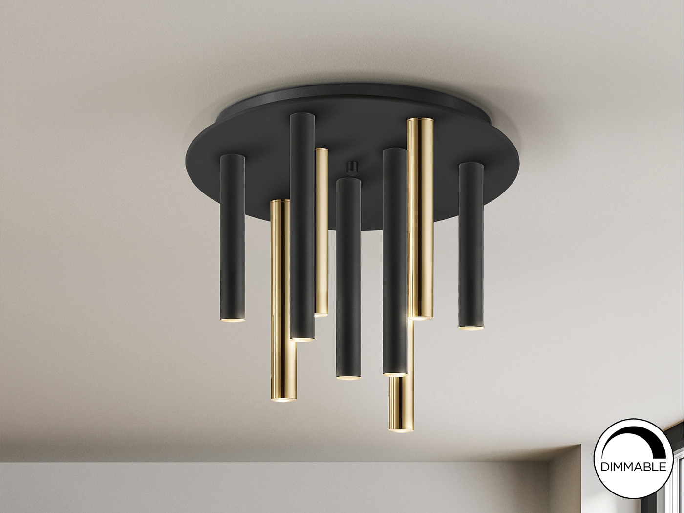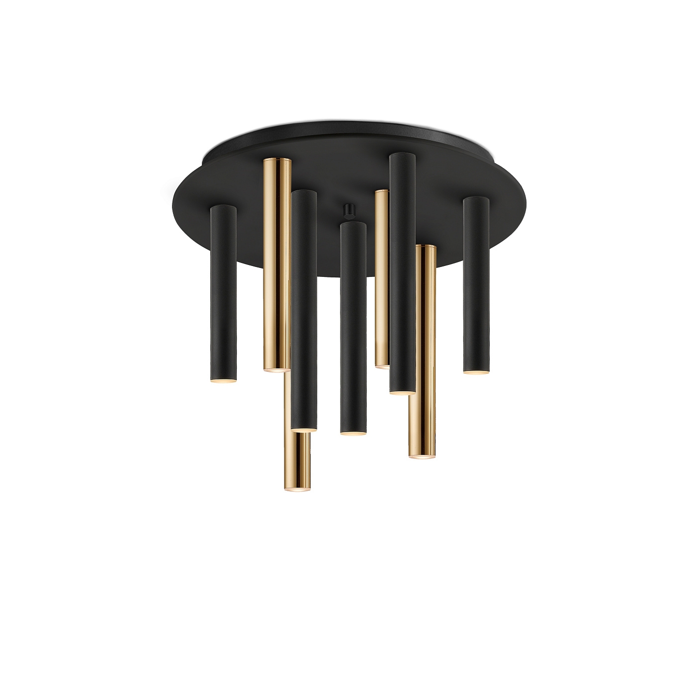 Потолочный светильник LED круглый с 9 лампами из металла с покрытием "блестящее золото" и с чёрным матовым покрытием. Акриловый рассеиватель опалового цвета, 45W LED, 4050 Lm, 3000 K. Диммируемый.