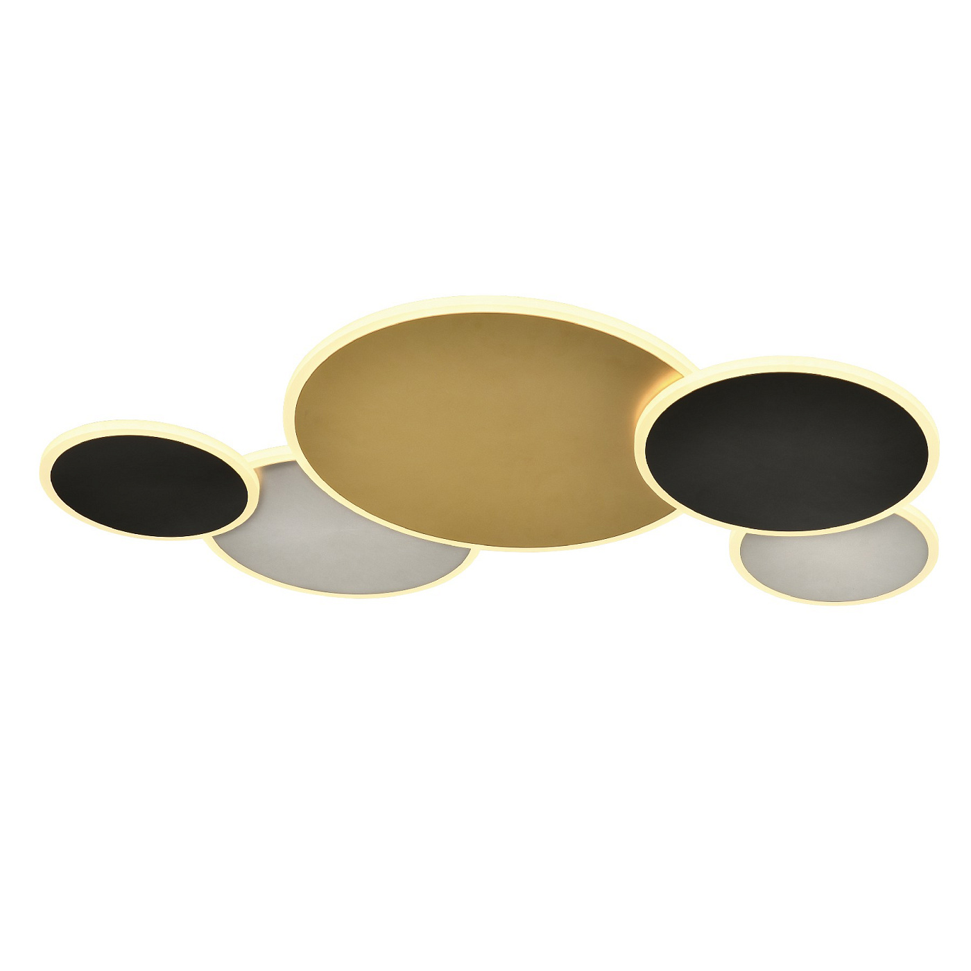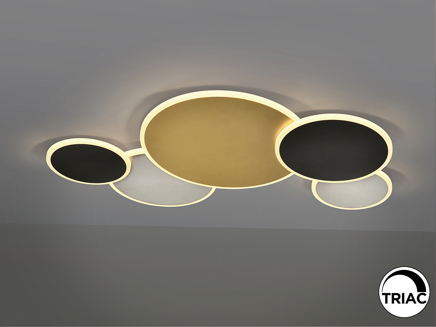 Потолочный светильник из металла и алюминия с отделкой золотистого, белого и черного матового цвета. Опаловый акриловый рассеиватель. 48 Вт, 2800 лм, 3000 К. ДИММИРУЕМАЯ. В этом продукте используется светодиодный драйвер симисторного типа и регулировка яркости 0–10 В. Его можно затемнить с помощью светодиодного настенного диммера с этими функциями. · Эта лампа поставляется с ГРАВИТАЦИОННЫМИ ПЕРЕКЛЮЧАТЕЛЯМИ для улучшения крепления к потолку.