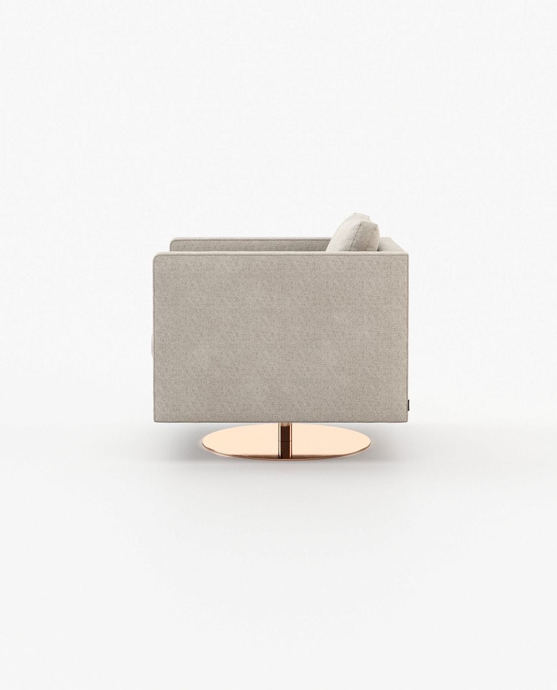 Кресло Marlow представляет собой квадратное изделие с круглым основанием. Сочетание форм позволяет весело играть с размерностью и придает дополнительный шарм декору.