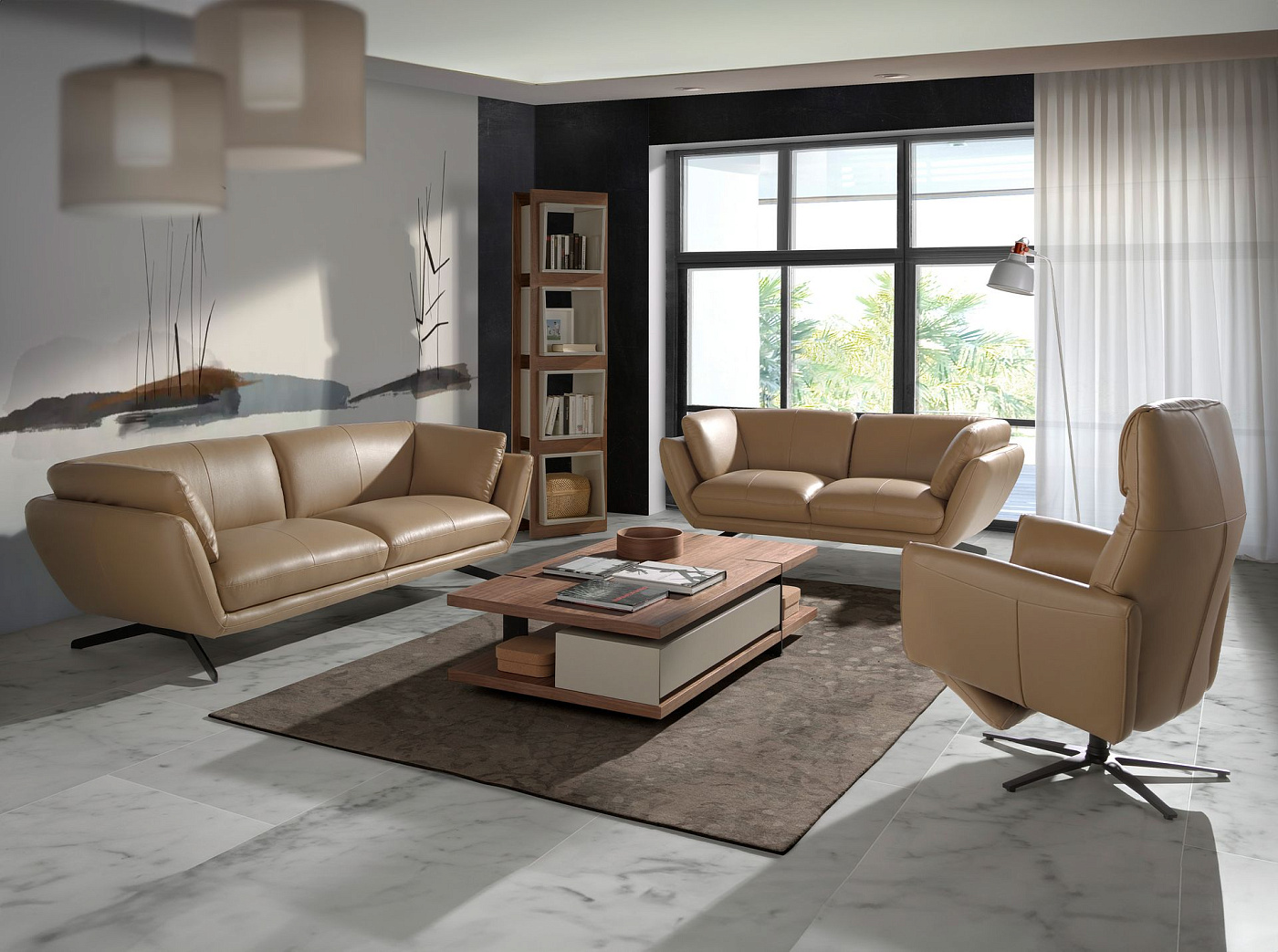 Вращающееся кресло с двумя независимыми электрическими механизмами релаксации. Обивка из бычьей кожи песочного цвета. Внутренняя структура из древесины сосны и прочное стальное основание, окрашенное черной эпоксидной смолой. Порт USB.