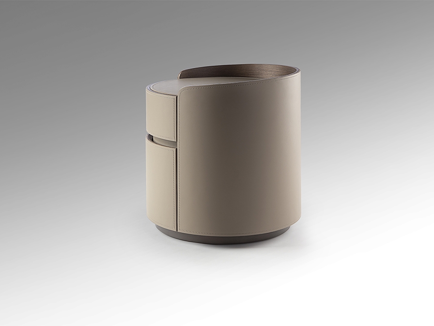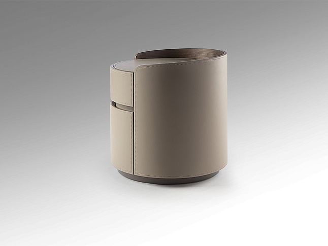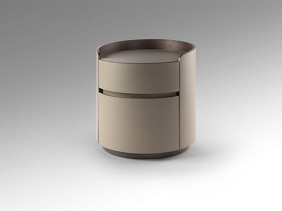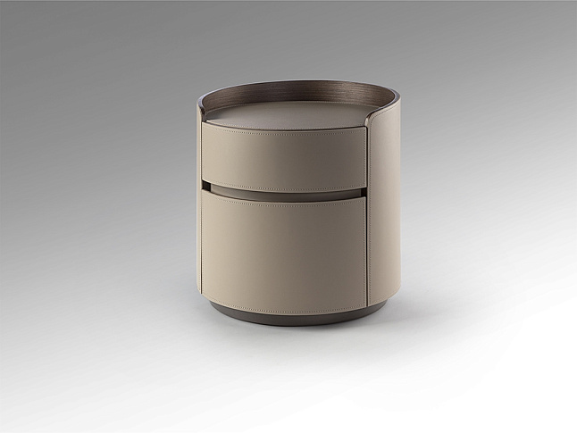 Круглый ночной столик с двумя ящиками на направляющих. Изготовлен из ореховой фанеры, обтянут бежевой кожей. Столешница из фарфора, отделка под мрамор с прожилками.