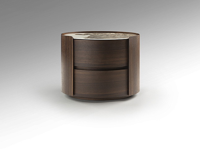 Овальный ночной столик с двумя ящиками на направляющих. Изготовлен из фанеры с отделкой под тёмный дуб. Столешница из фарфора с отделкой под мрамор с прожилками.