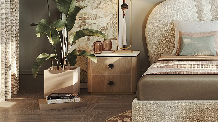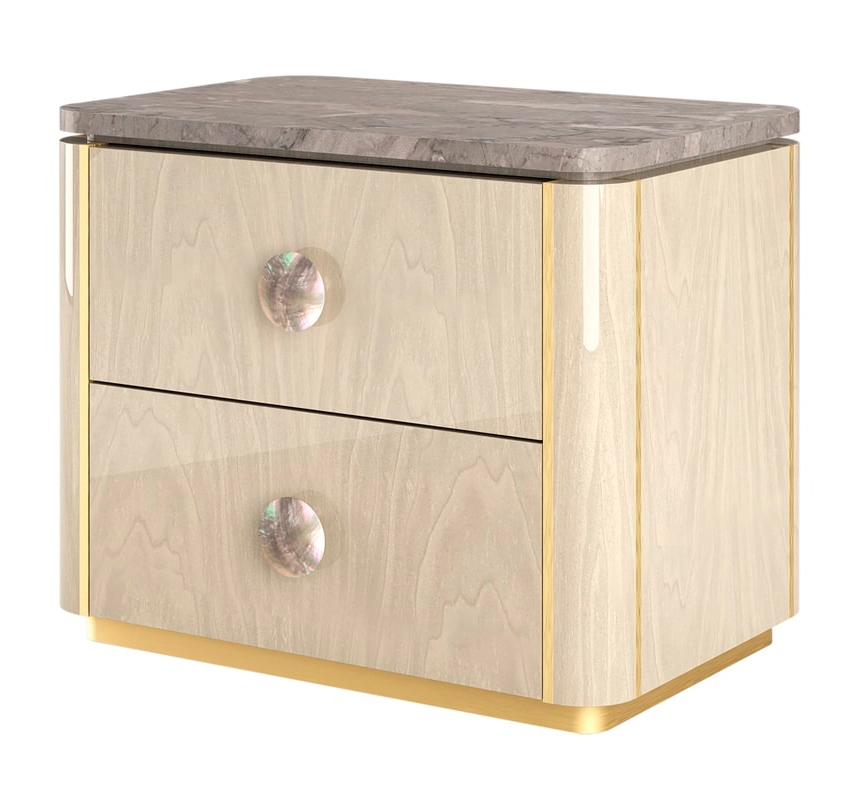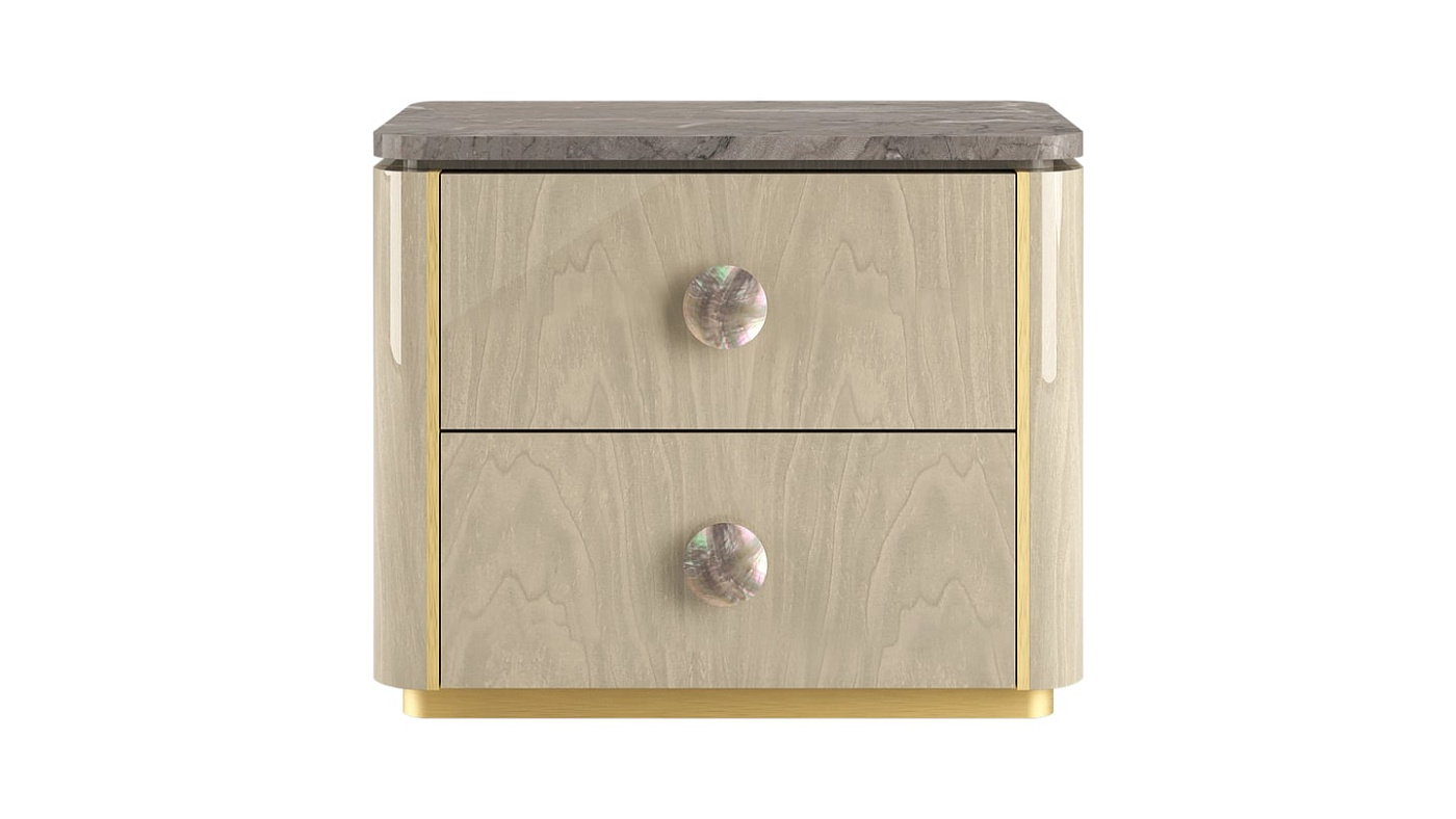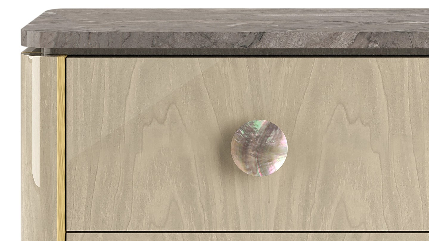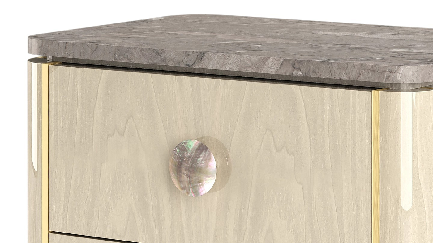 "Прикроватный столик BERNA имеет вневременной дизайн и возвышает его за счет применения неожиданных материалов и деталей. Облицовка камнем и деревом придает изделию патину, детали из матовой латуни придают ему четкость, а черные перламутровые ручки придают изящество. "
