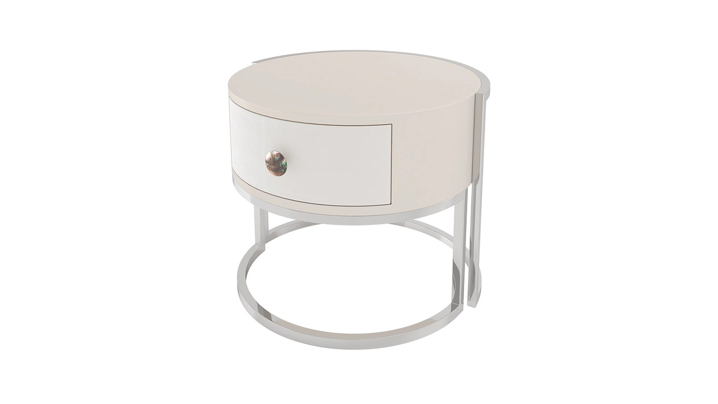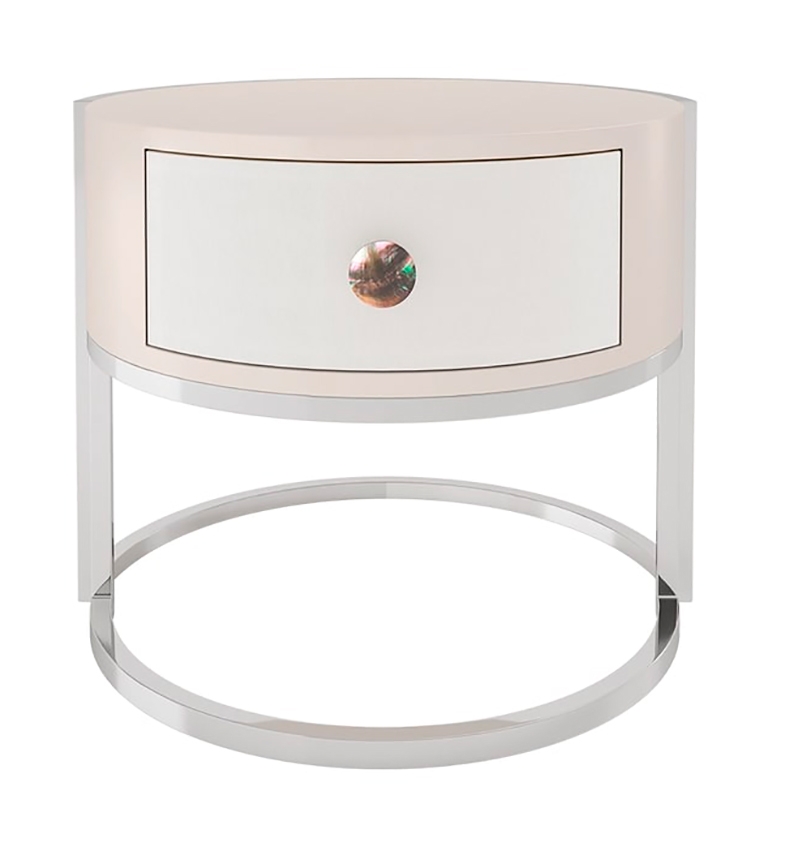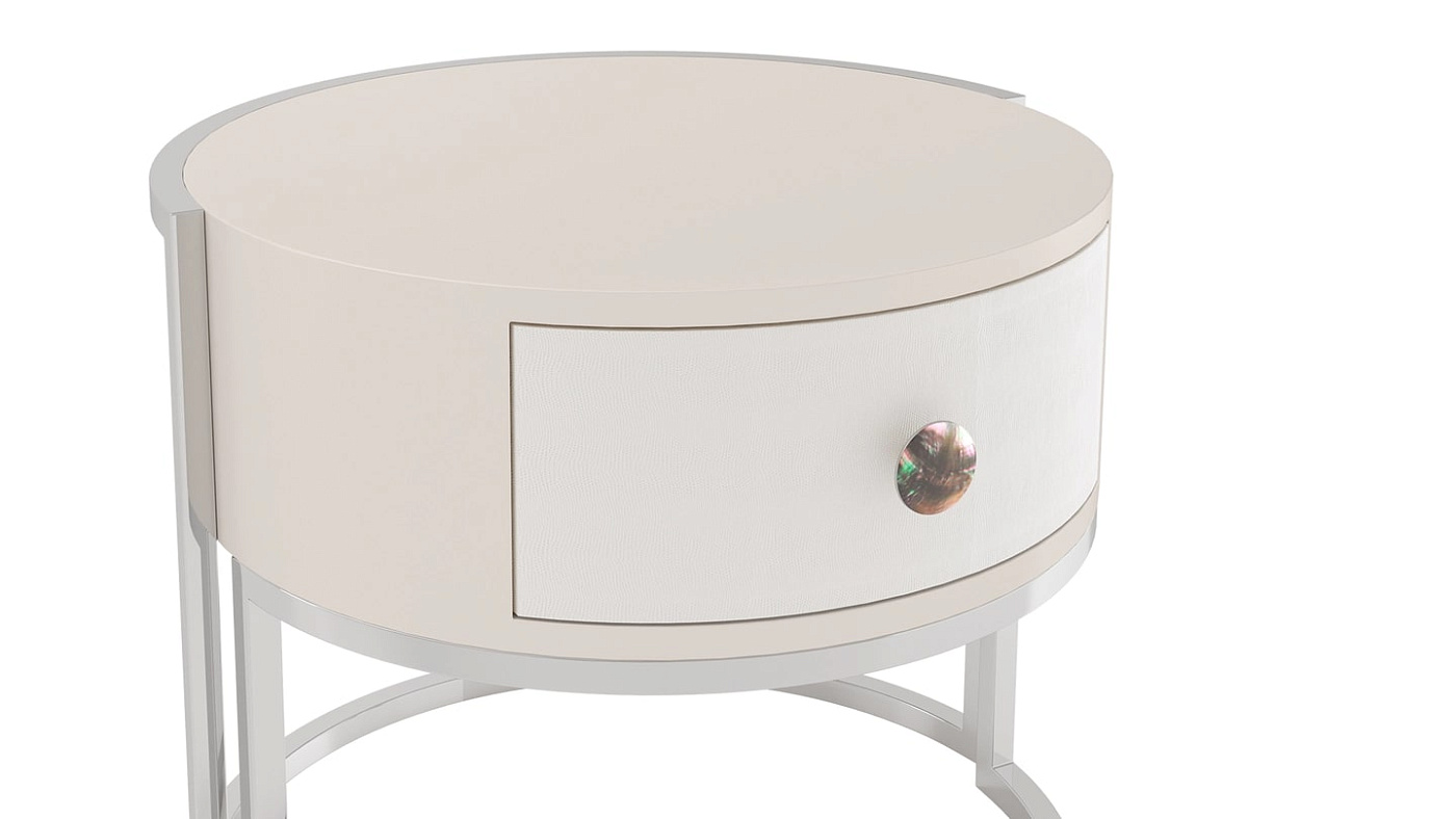 "Прикроватный столик "КАБОШОН" оснащен круглой лакированной шкатулкой и выдвижным ящиком из белой кожи, отделанным черной перламутровой ручкой. Он опирается на каркас из полированной нержавеющей стали, который спереди выглядит как единое целое, но на самом деле состоит из двух отдельных половинок. "
