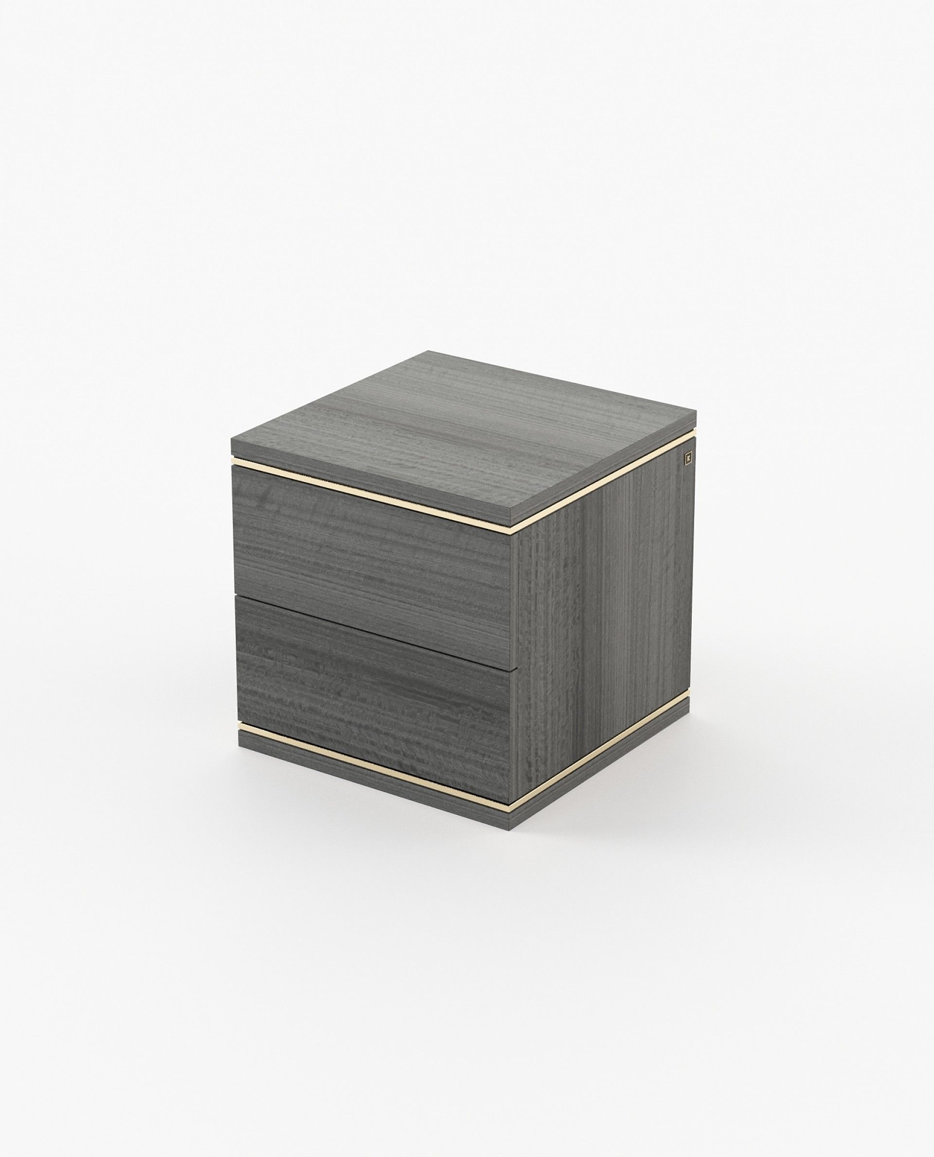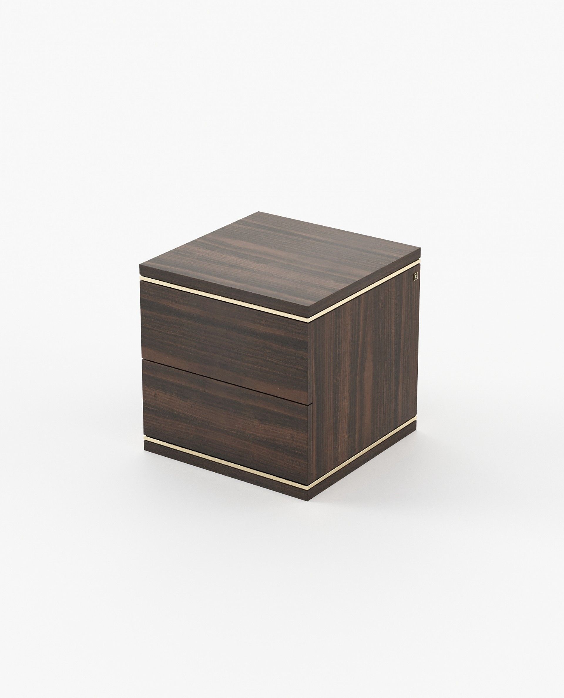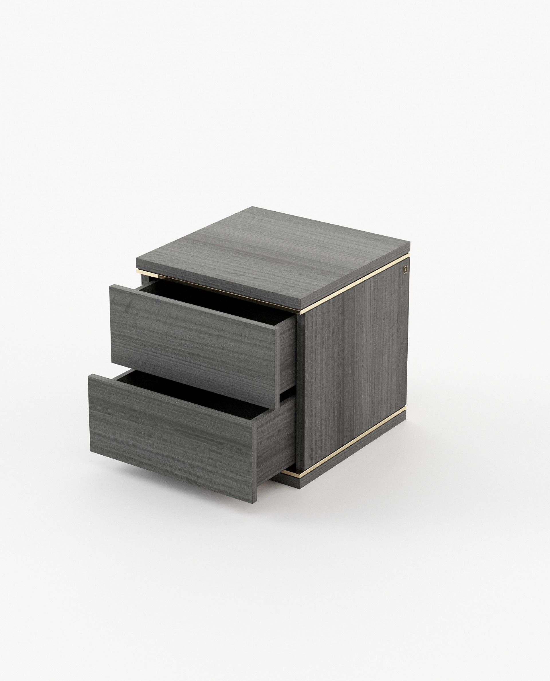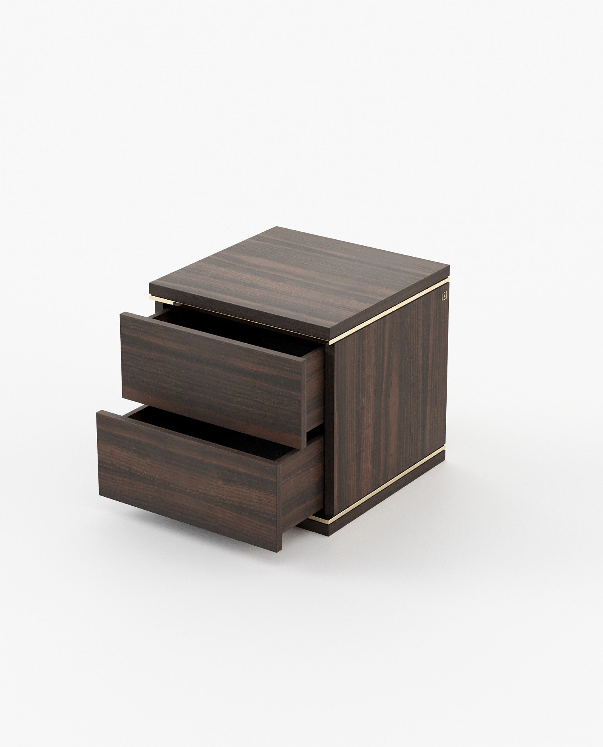 Прикроватная тумба Duane выполнена из дерева и с акцентом на золотом фризе. Элегантная металлическая деталь контрастирует с благородным тоном, что делает дизайн изделия идеальным выбором для широкого спектра интерьеров.