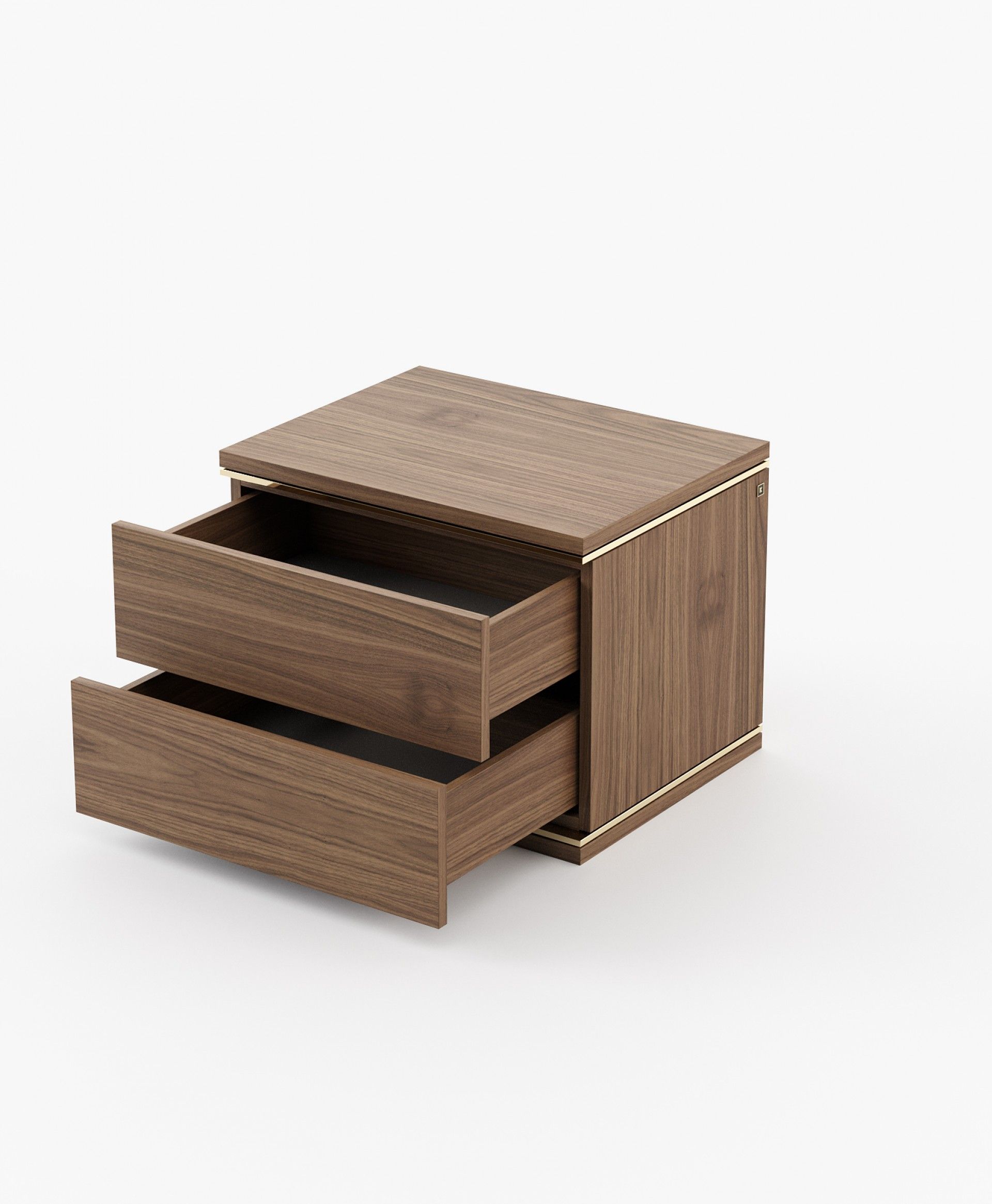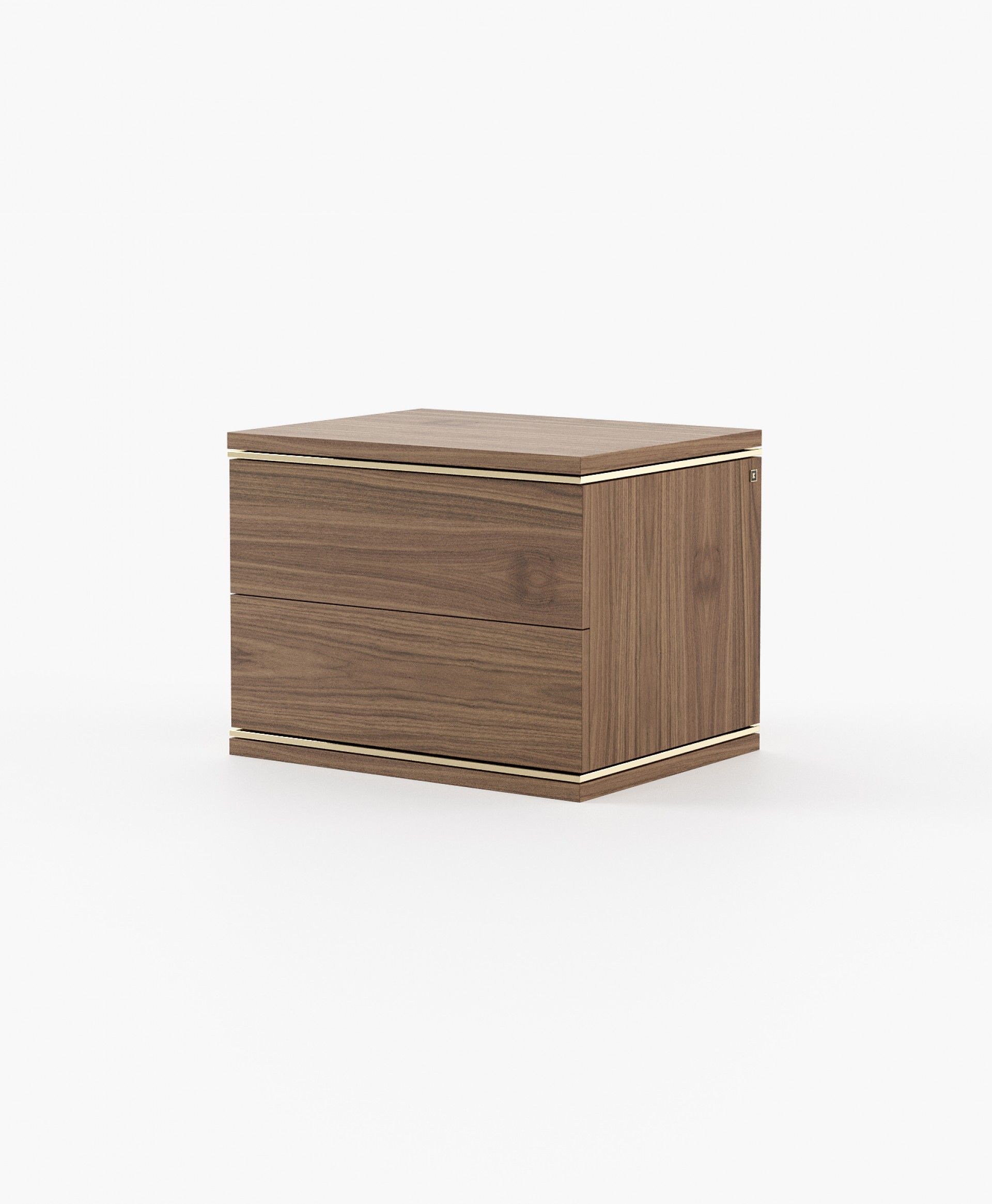 Прикроватная тумба Duane выполнена из дерева и с акцентом на золотом фризе. Элегантная металлическая деталь контрастирует с благородным тоном, что делает дизайн изделия идеальным выбором для широкого спектра интерьеров.