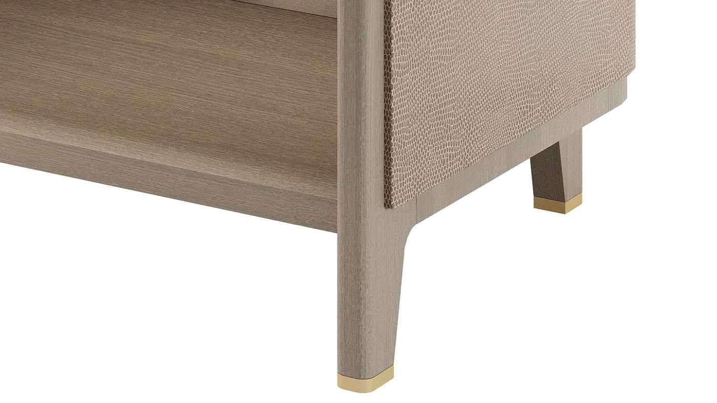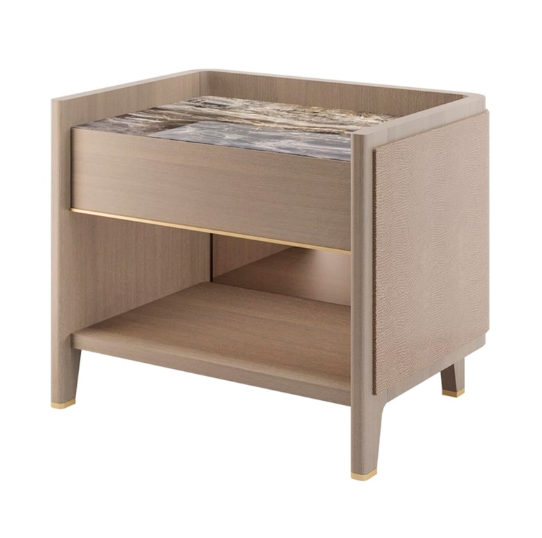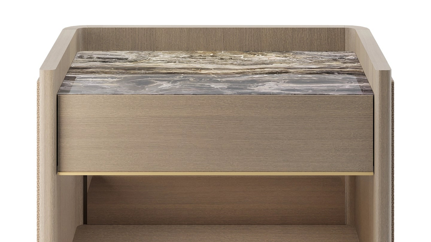 Гладкая каменная поверхность, обтянутая кожей панель и отражающее бронзовое зеркало внутри придают минималистским линиям прикроватного столика HVAR неожиданные оттенки.