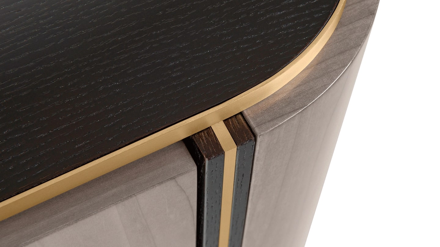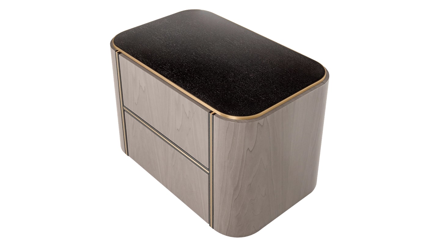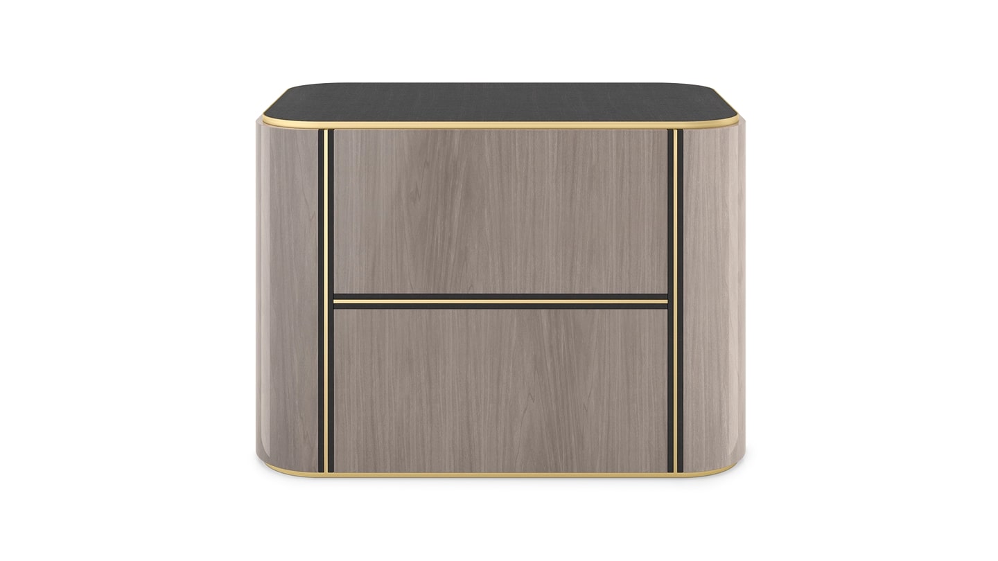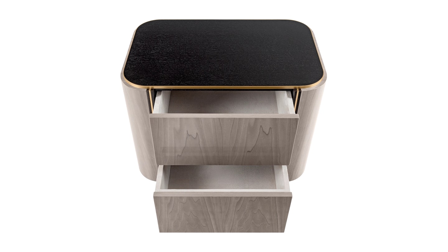 Изящный прикроватный столик KENT в форме изогнутого куба оснащен двумя отделанными замшей выдвижными ящиками без ручек, отделанными шпоном темного дерева и матовой латунью. Они выделяются на фоне облицованного серым шпоном фасада, создавая Н-образный узор спереди.