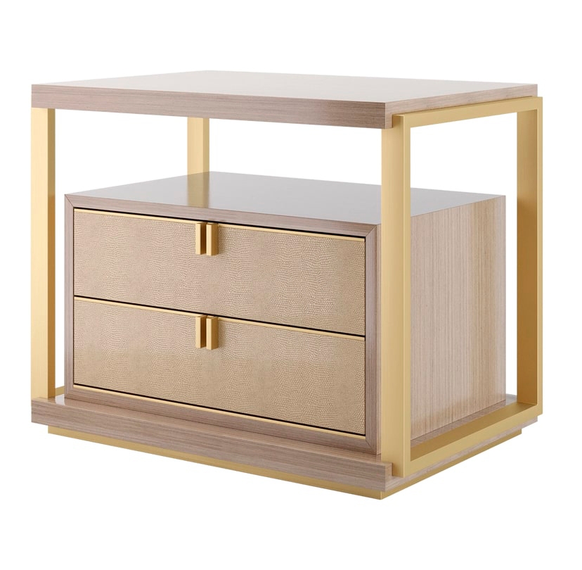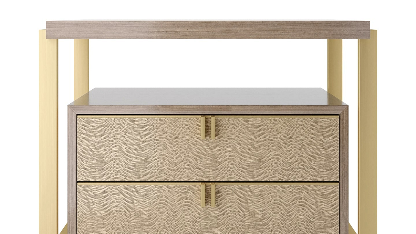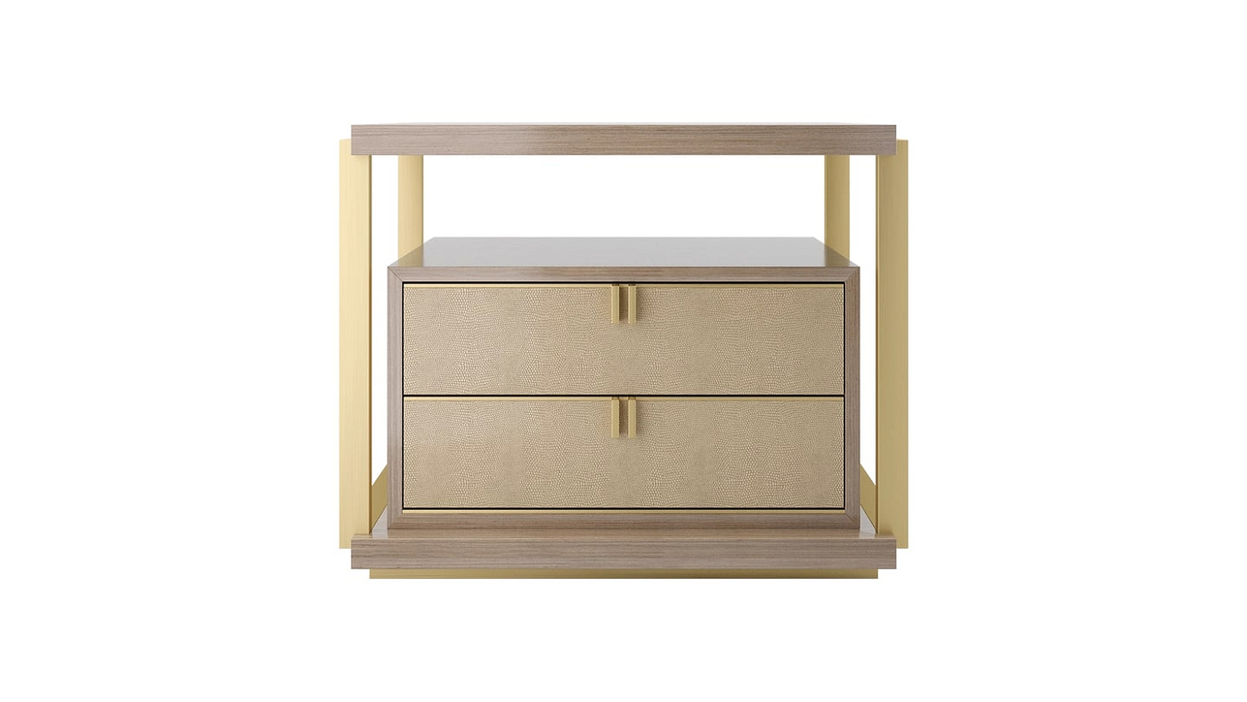 Воплощая идею дизайна в дизайне, прикроватный столик LEXTON представляет собой коробку из глянцевого деревянного шпона с двумя выдвижными ящиками с латунными ручками, кожаными фасадами и замшевыми внутренностями. При этом взаимосвязанная структура из шпона и металла создает дополнительное пространство на поверхности и мгновенный эффект "вау".