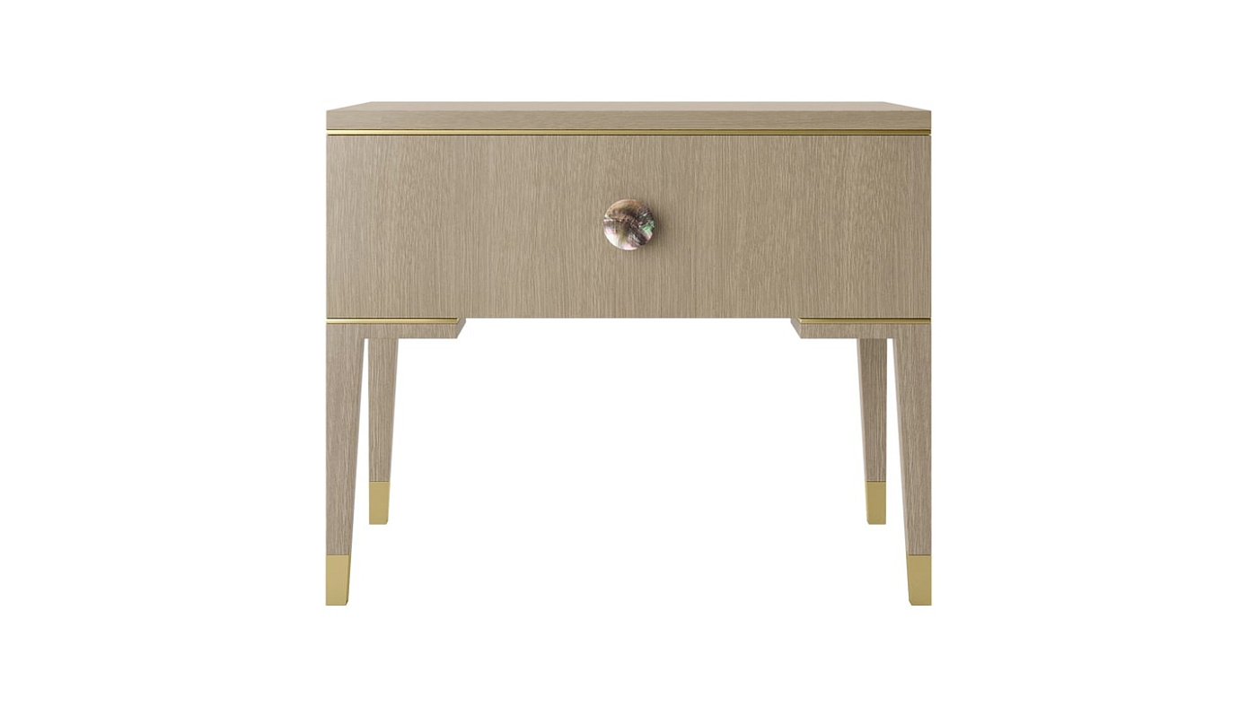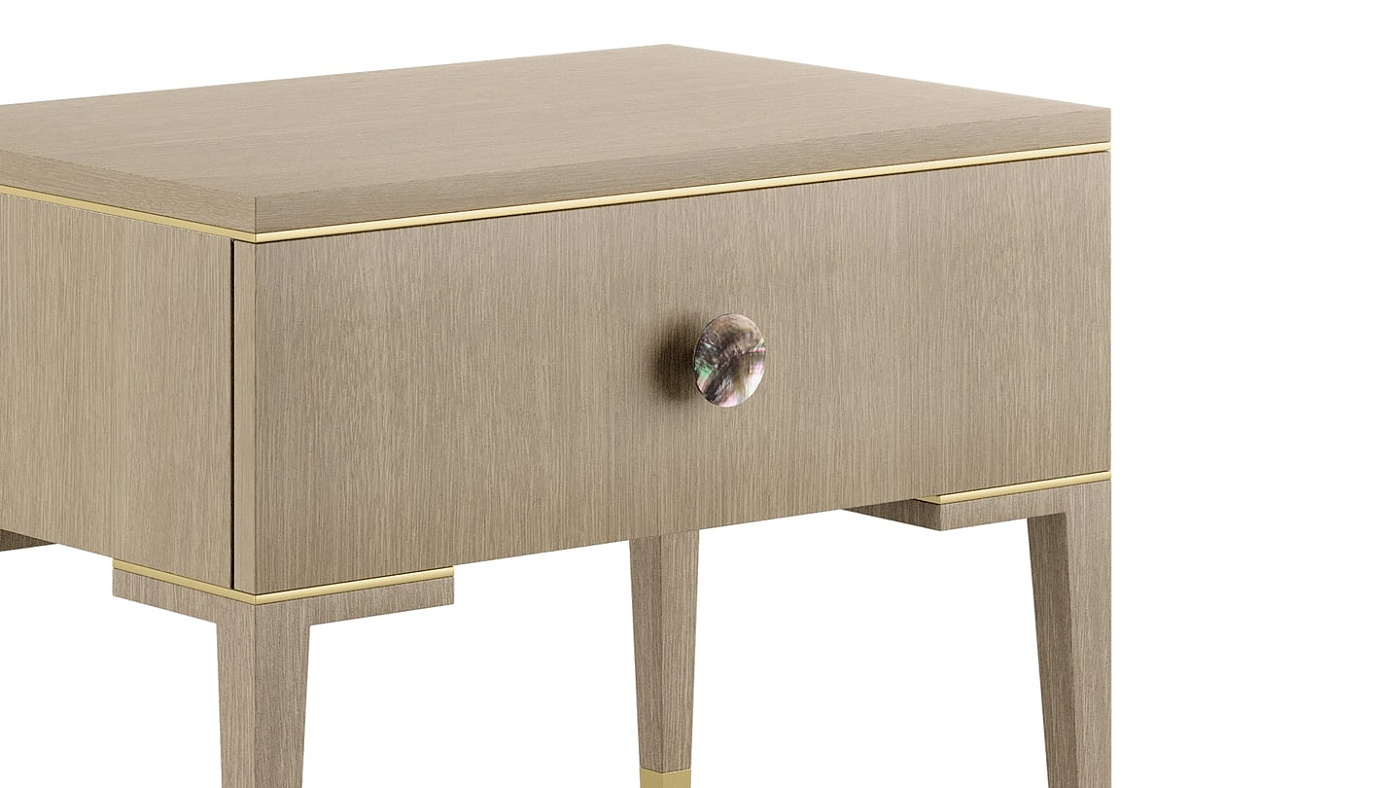 Четкие линии прикроватного столика MOONSTONE, облицованного деревянным шпоном, подчеркнуты деталями из матовой латуни, которые подчеркивают его утонченный силуэт в стиле ар-деко, а круглая ручка, отделанная черным перламутром, придает завершающий штрих.