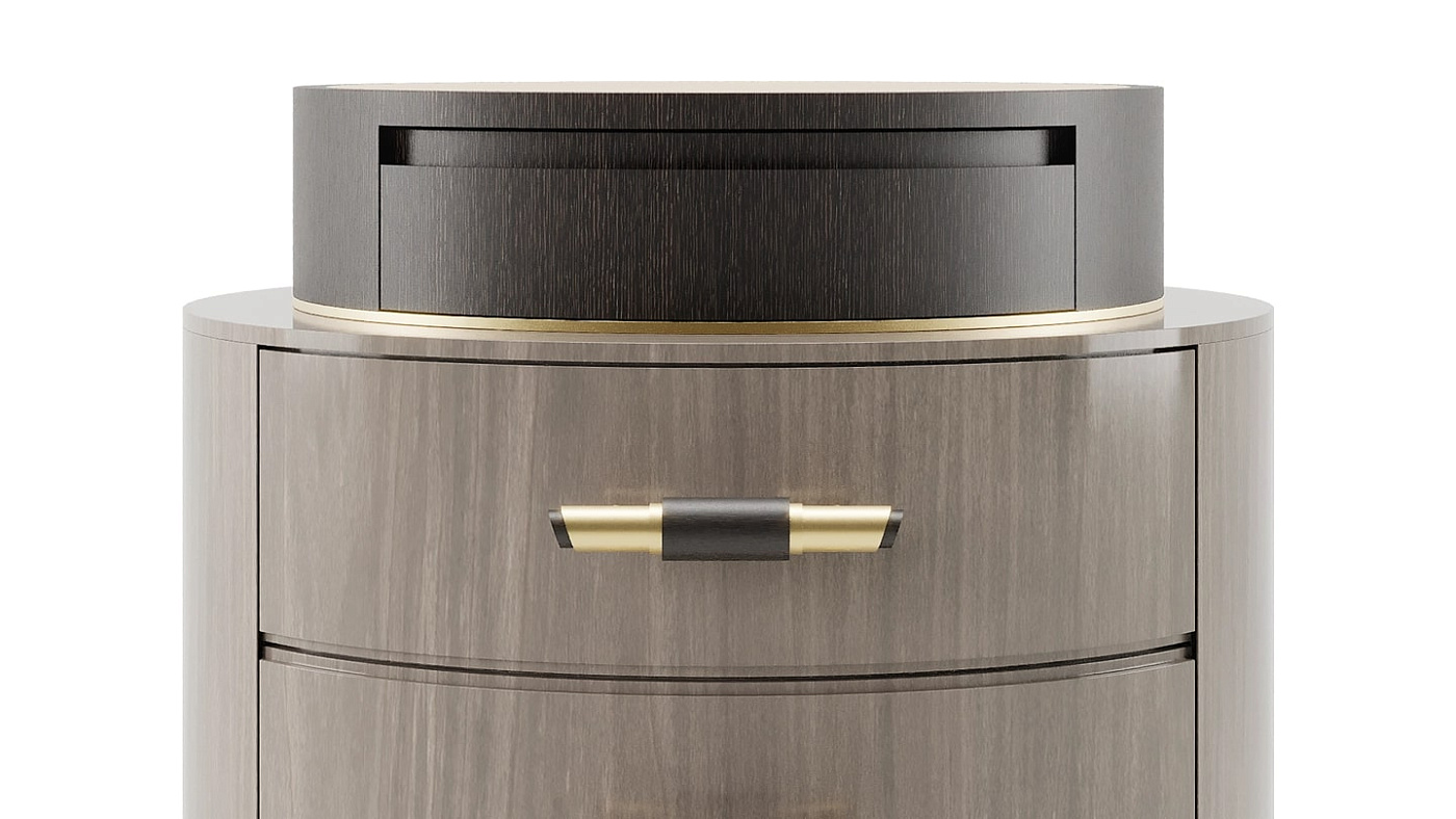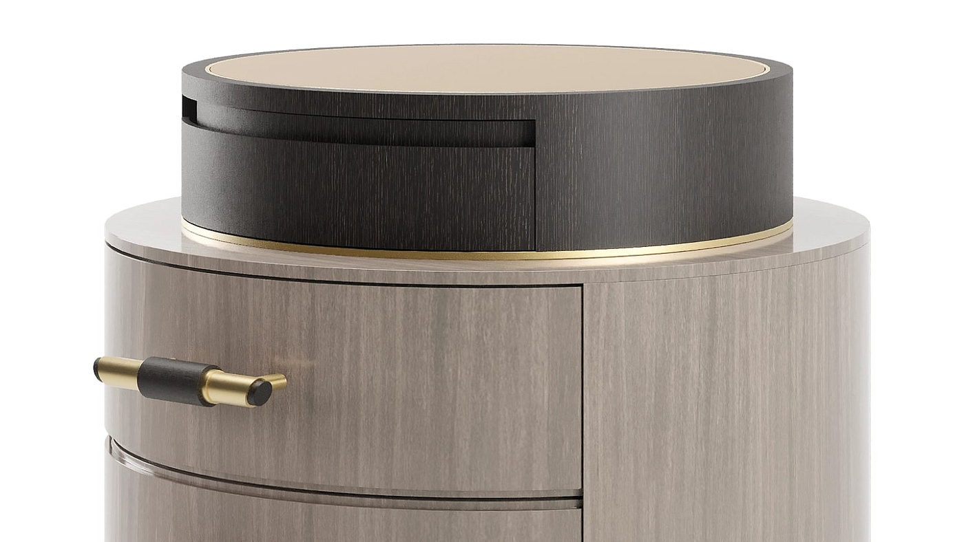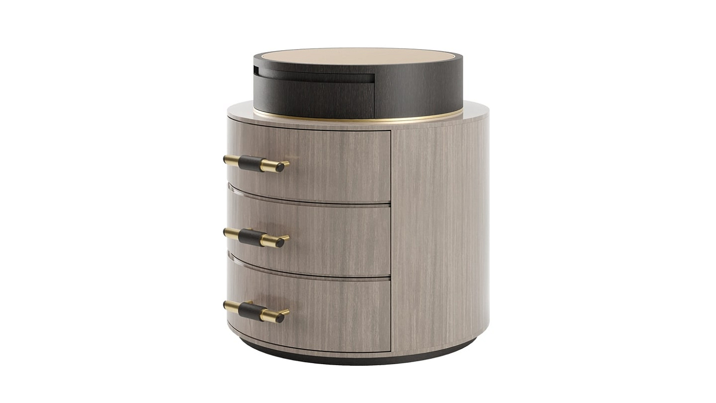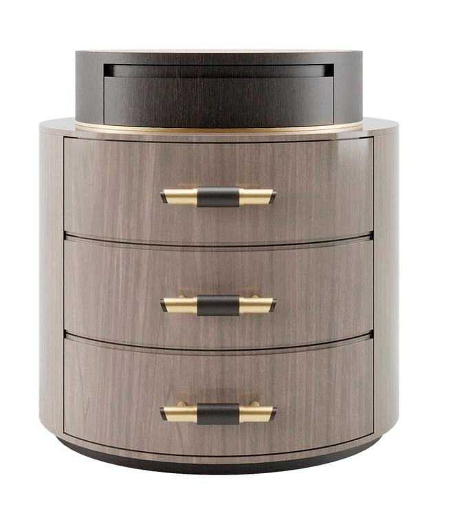 Изящный круглый дизайн с тремя выдвижными ящиками, обшитыми замшей, прикроватным столиком TULSA, отделанным деревянным шпоном и матовой латунью, имеет козырь в рукаве: подставку, увенчанную бронзовым зеркалом. Дополните аксессуарами настольную лампу, и она будет игриво отражать свет вокруг вашего спального места.