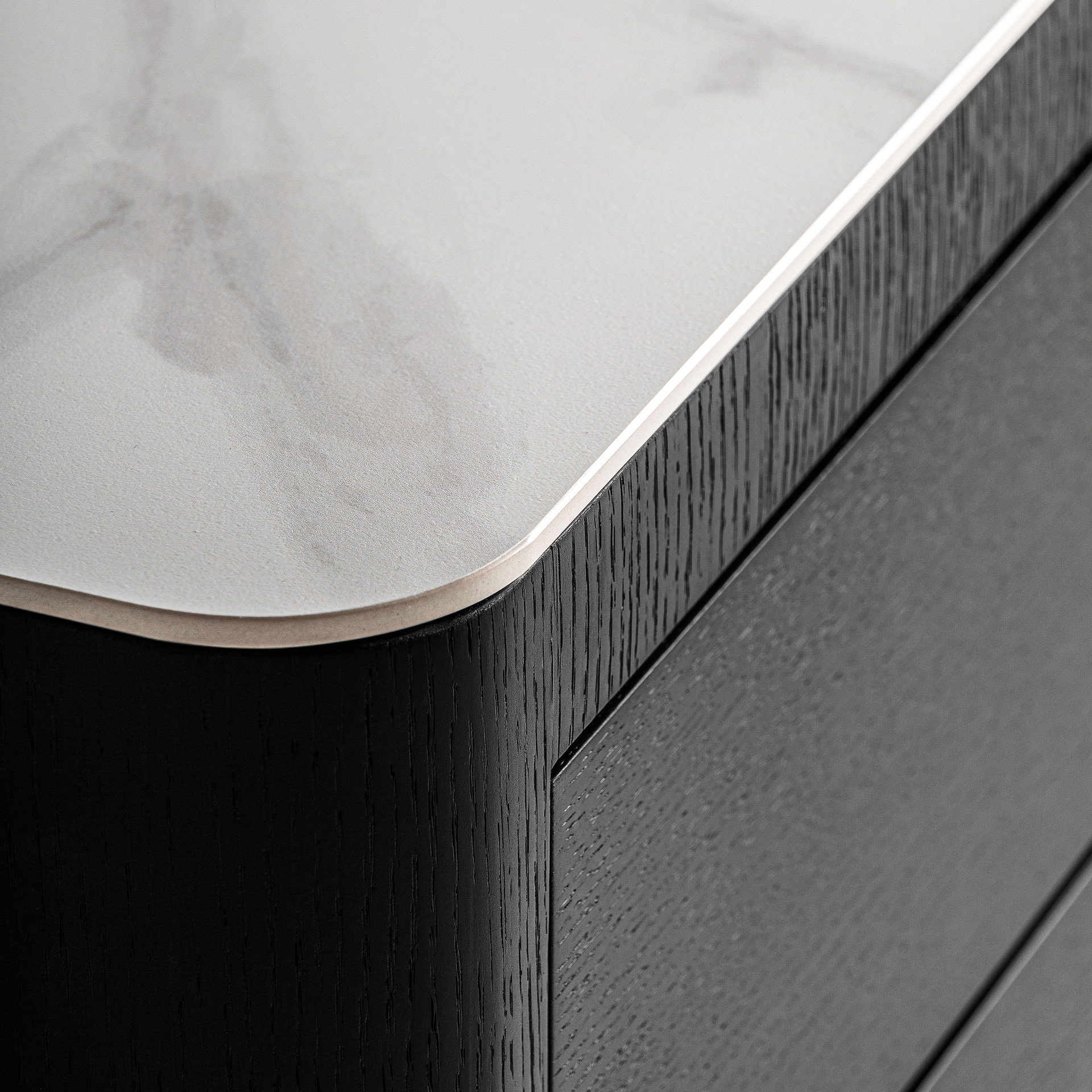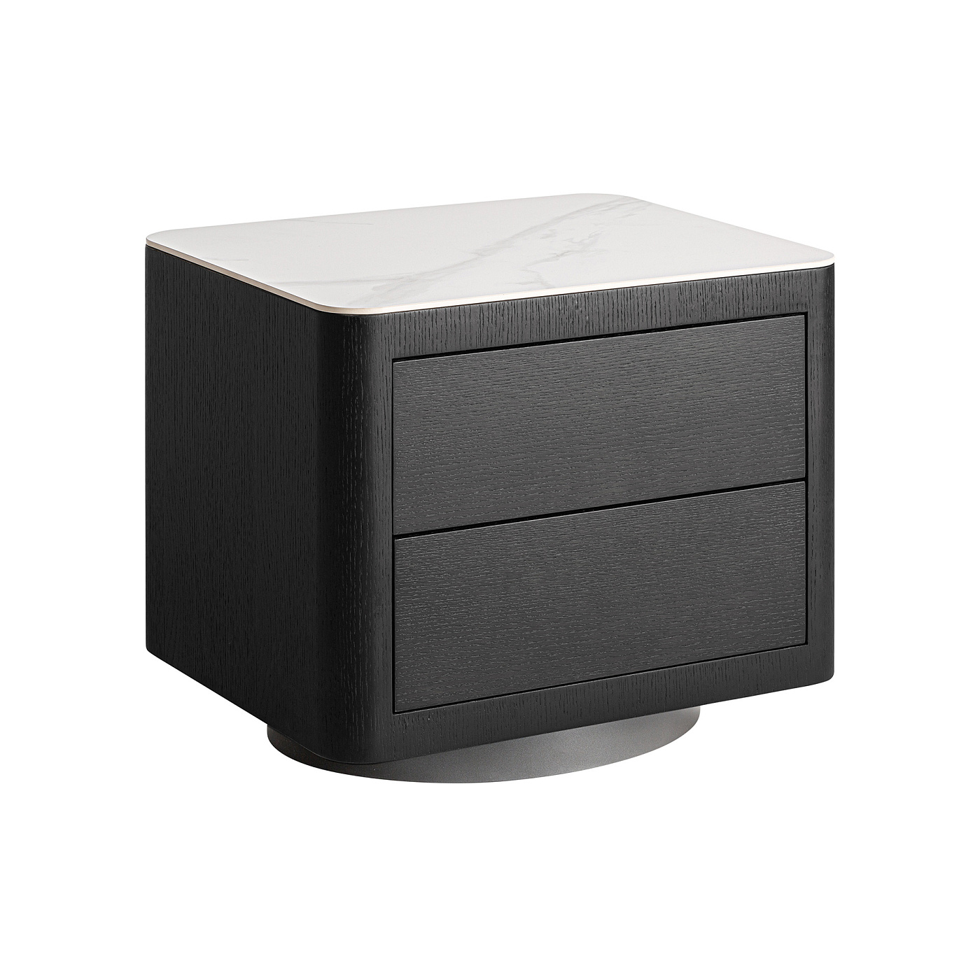 Прикроватная тумбочка целиком, в стиле ар-деко, изготовлена из МДФ черного цвета, в сочетании с серым дубовым шпоном и белым спеченным камнем. Ширина: 55 см, Глубина: 45 см, Высота: 49 см