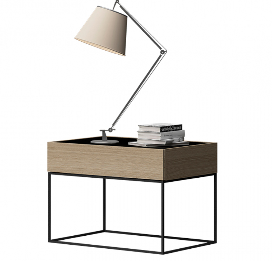 Металлическая конструкция черного или золотого цвета образует основание, на которое опирается верхний выдвижной ящик. Легкость комбинации позволяет ей вписаться в любой стиль спальни. Обратите внимание на детали верхней керамической столешницы.