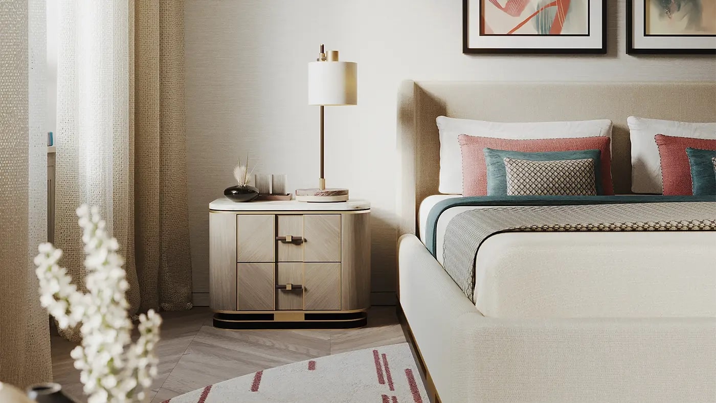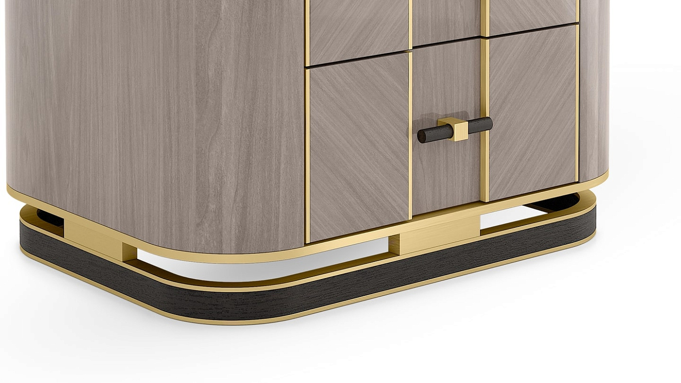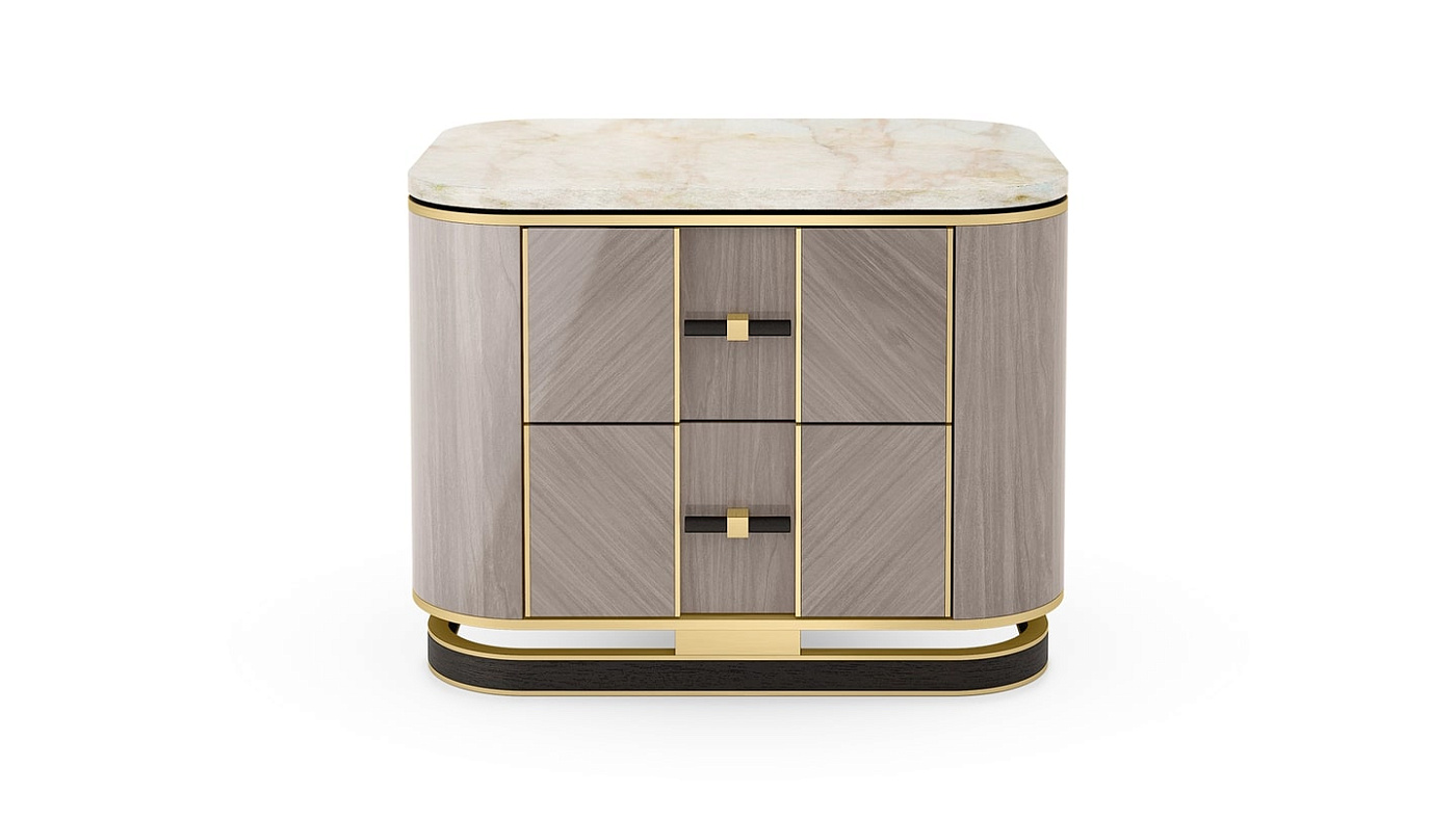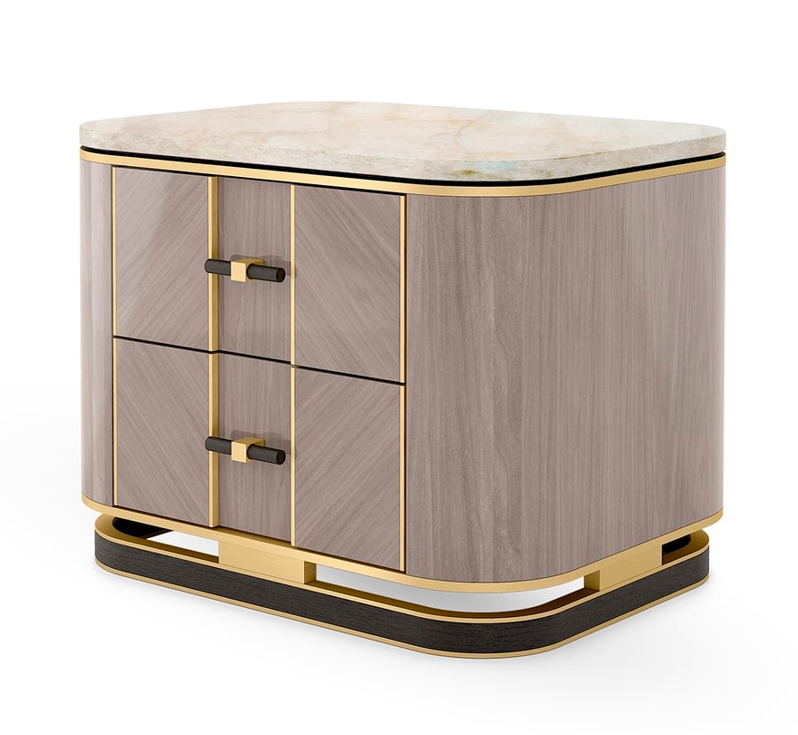 Прикроватный столик ASHI наполнен характером. Изогнутый куб, изготовленный из деревянного шпона, с двумя отделанными замшей выдвижными ящиками, открывающимися скульптурными ручками из цельного дерева и матовой латуни. Дополнительные детали включают в себя основание каркаса и каменную поверхность, прохладную на ощупь.