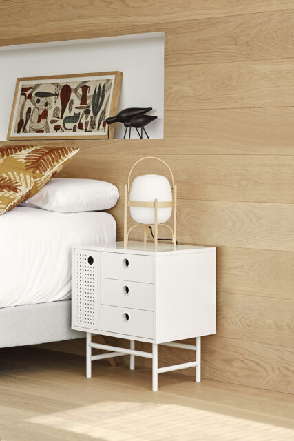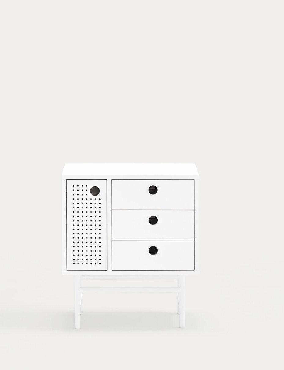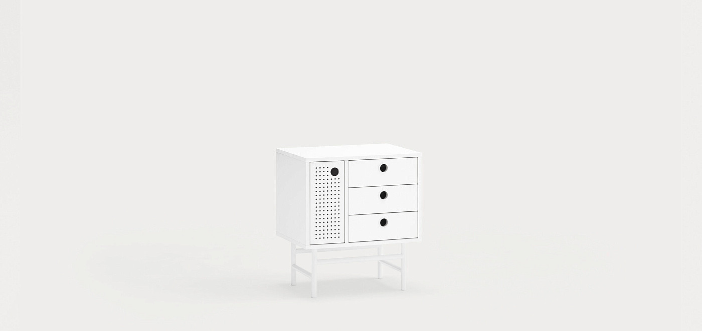 Прикроватная тумбочка Punto, оформленная в индустриальном стиле, сочетает в себе эти эстетические концепции с дизайном и функциональностью. Коллекция отличается перфорированными металлическими дверцами со встроенными круглыми ручками. Корпус выполнен в лакированном МДФ различных цветов.