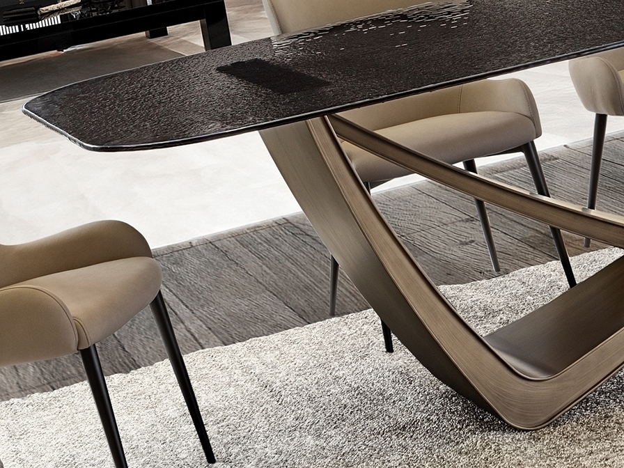 Обеденный стол из металла с отделкой под состаренную бронзу. Столешница из серого термоформованного стекла с текстурированной поверхностью.