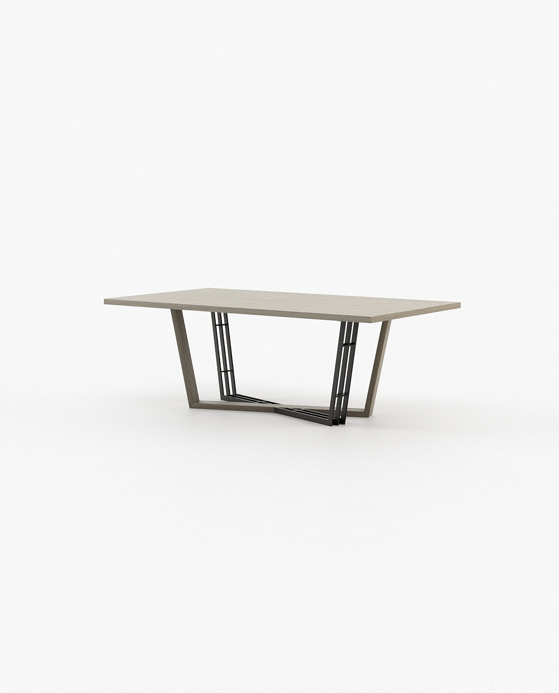 Alison – впечатляющий обеденный стол с деревянной столешницей и основанием, украшенным металлическими деталями. Его асимметричная структура создает индивидуальность, а сочетание текстур добавляет смелый оттенок в оформление, поэтому это изделие является неотъемлемой частью декора.