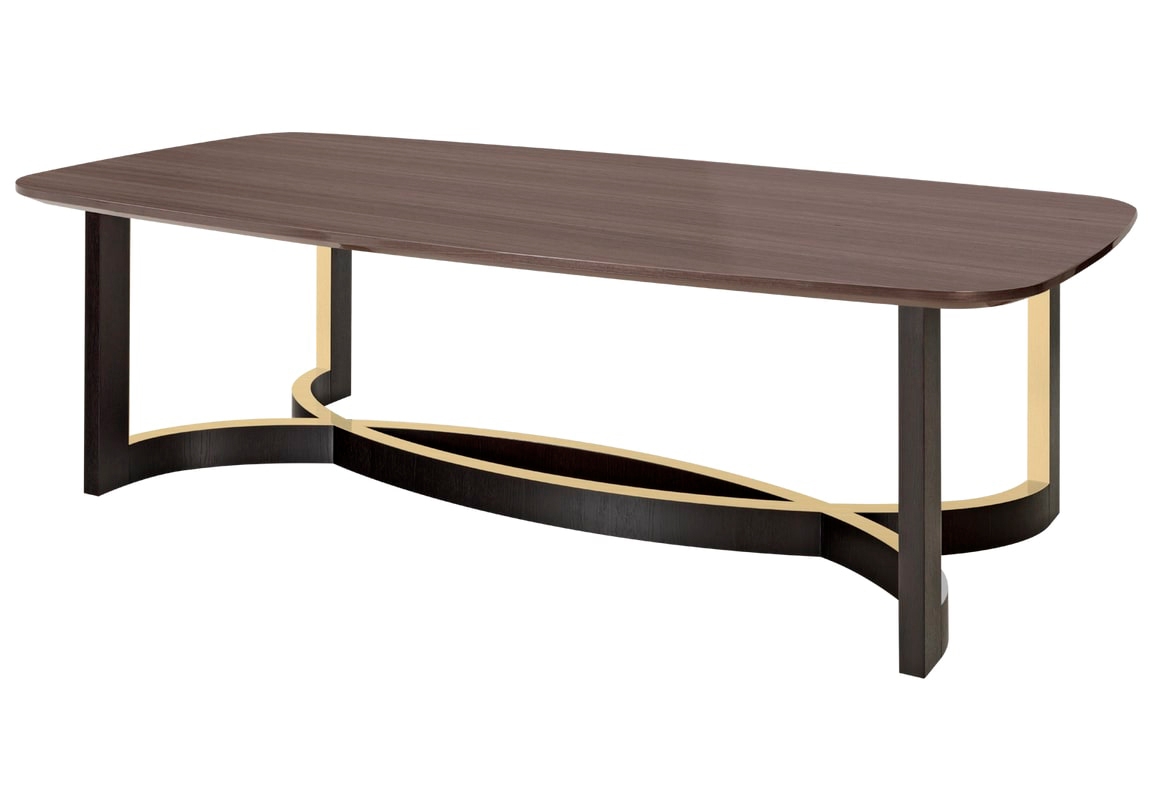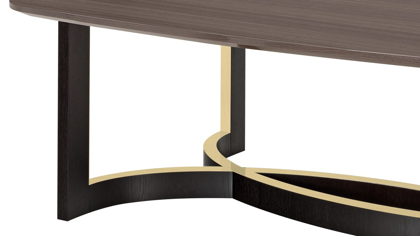 Впечатляющие размеры обеденного стола AMMAN размером 260 на 130 сантиметров позволяют с комфортом разместить до 10 гостей. Выполненная из гладкого деревянного шпона, обтекаемая поверхность придает драматизм скульптурному основанию, которое представляет собой переплетающиеся полукруги, окантованные матовой латунью.