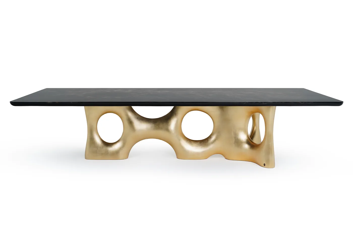 Погрузите свое обеденное пространство в обеденный стол COSMIC, шедевр скульптурного величия. Прямоугольная столешница может похвастаться эксклюзивной черно-золотой мраморной отделкой, добавляя изысканности каждой встрече. Примите скульптурный и смелый силуэт, отделанный сусальным золотом, который определяет COSMIC, превращая вашу обеденную зону в витрину художественной утонченности. Каждый изгиб и контур рассказывают историю непревзойденного мастерства, делая этот обеденный стол выразительным произведением, которое превосходит обыденность, предлагая гармоничное сочетание художественного очарования и современной изысканности.