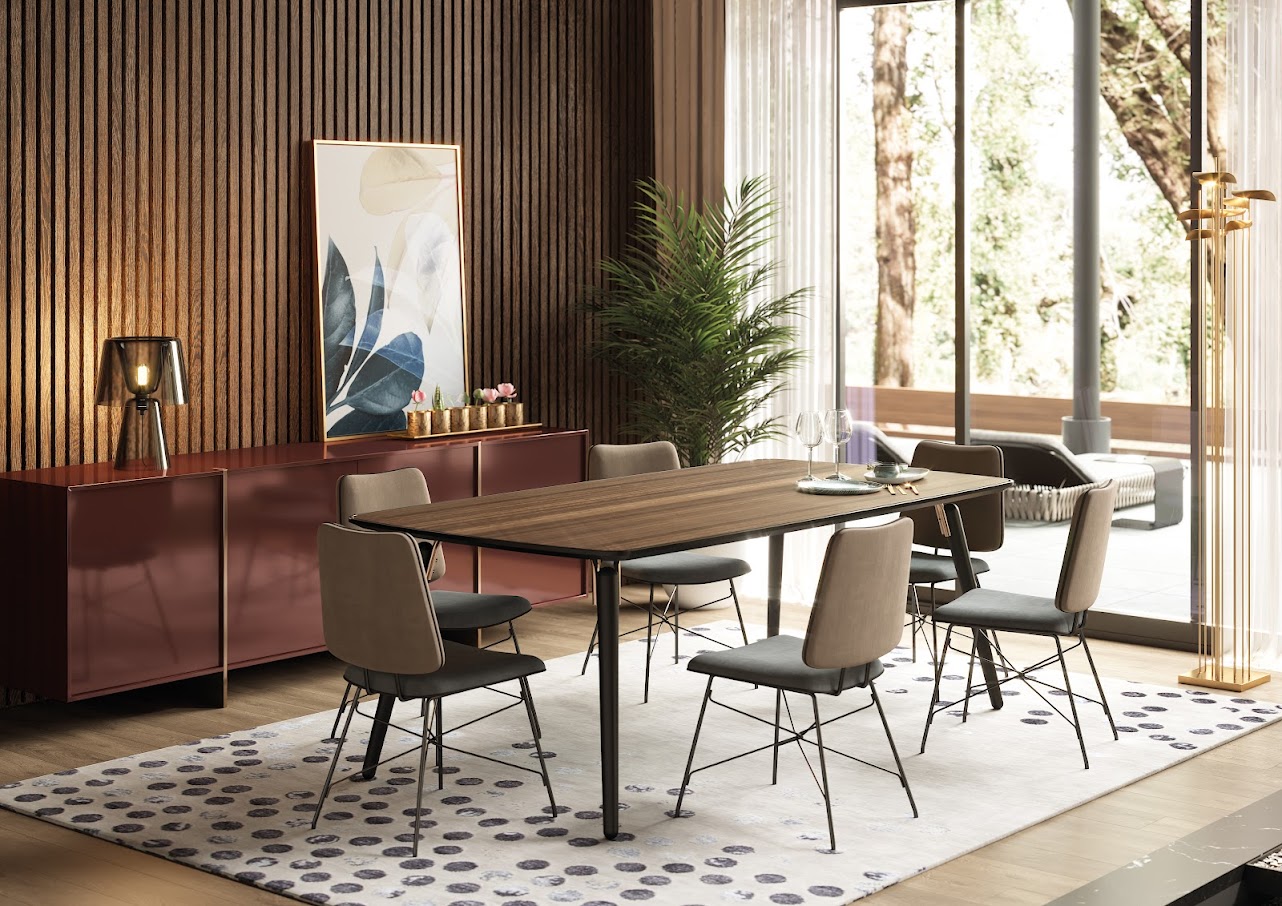 Трубчатая конструкция из покрытых нержавеющей сталью деталей столешницы Hyde's из деревянного шпона и выточенных ножек из цельного дерева передает ощущение левитации и отличает его от типичного образа обеденных столов.