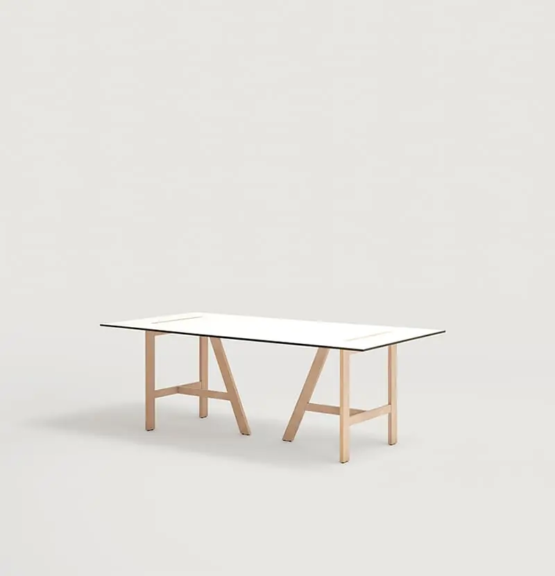 Гибкая и модульная коллекция столов с двумя основаниями из бука в виде козелков. Столешница из 19-мм HDF с меламиновой смолой или HPL с защитой от отпечатков пальцев. Доступно в 4 размерах: 150 x 75, 180 x 100, 210 x 100 и 240 x 120 см.