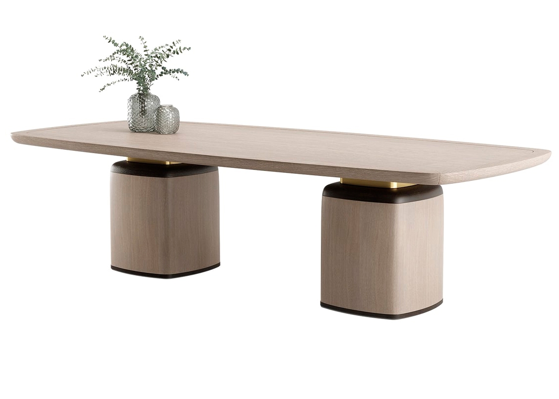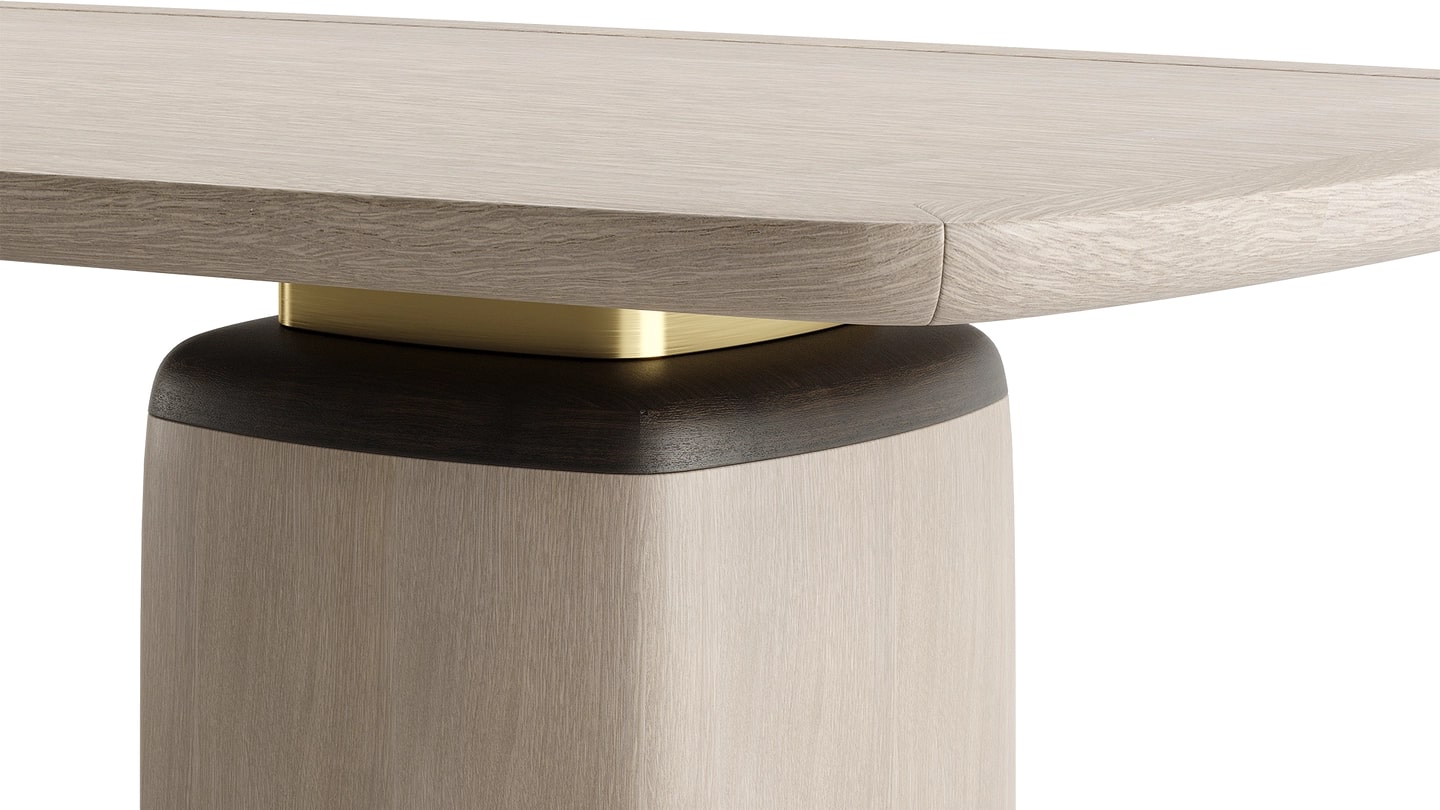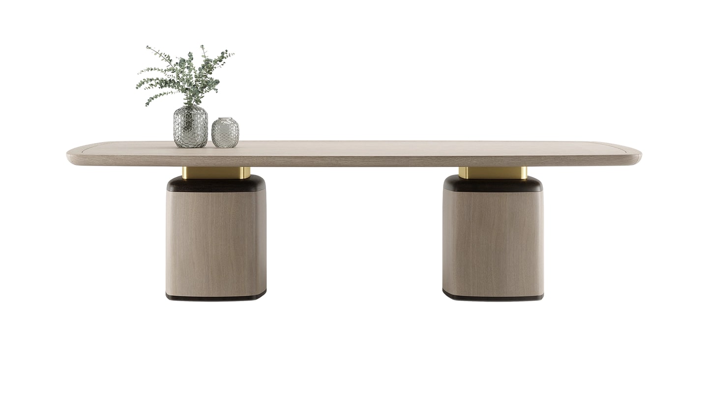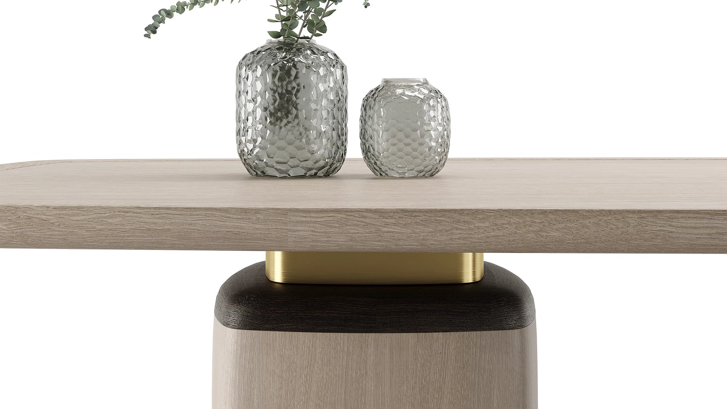 Величественный обеденный стол НАГАНО получил свое название в честь японского города, который известен как центр духовных достопримечательностей и природного великолепия. Преимущественно отделанный шпоном мягкого серого дерева, его украшения из более темного дерева и матовой латуни подчеркивают величественный силуэт обеденного стола.