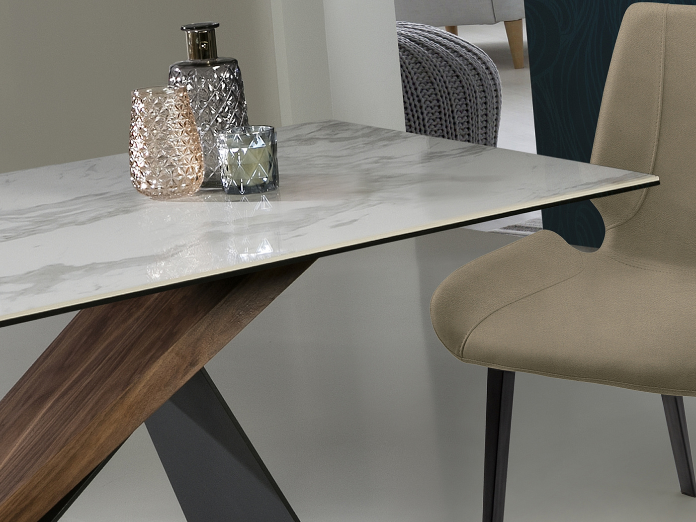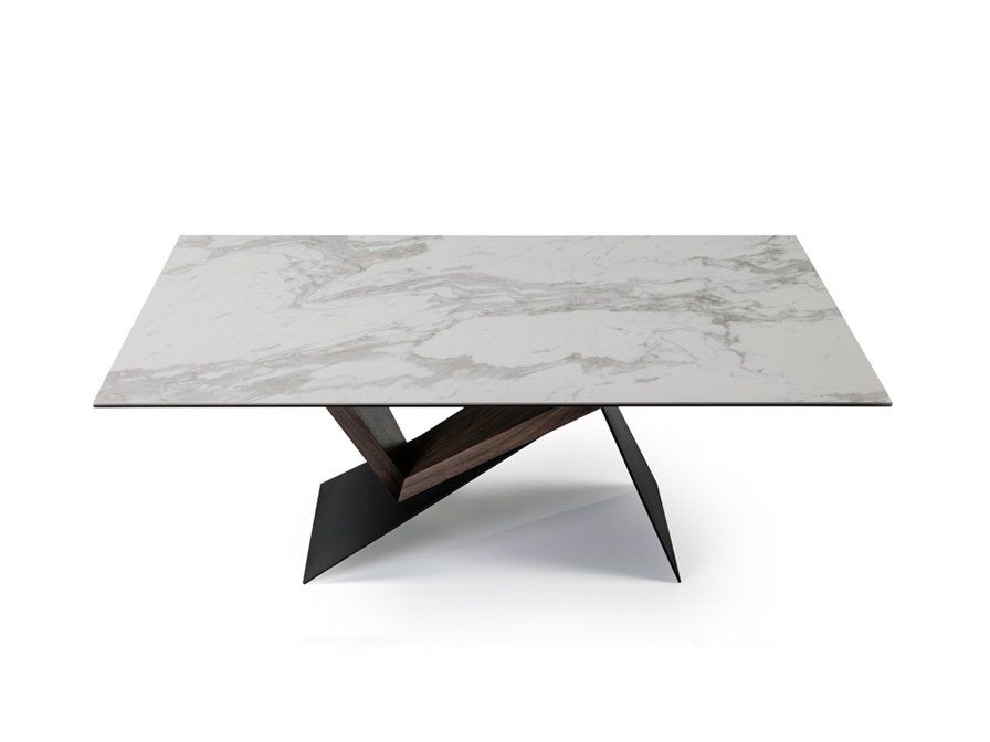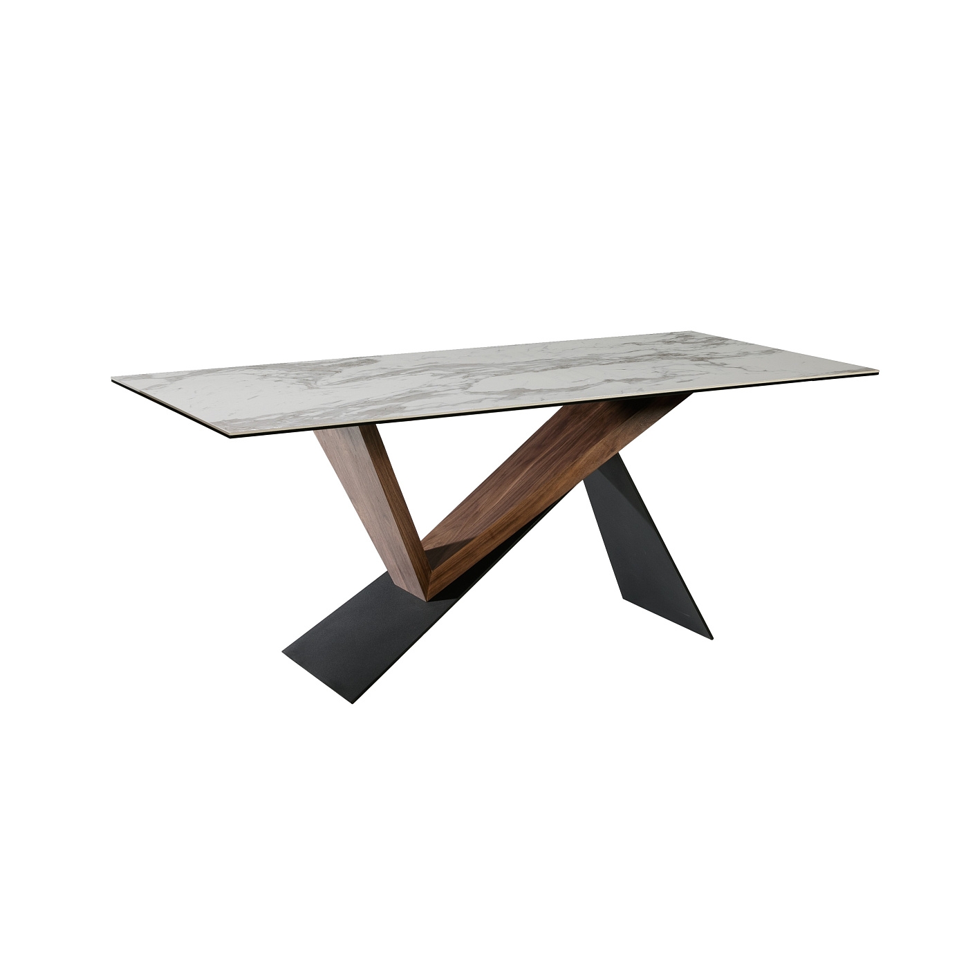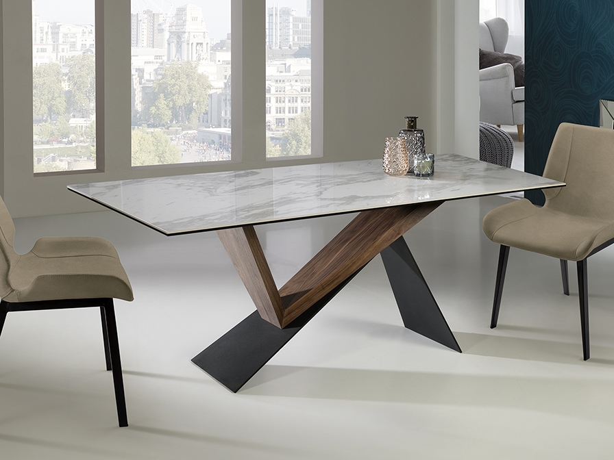 Стол обеденный из металла с матовым чёрным покрытием и дерева ореха. Столешница из керамики и стекла с рисунком "белый мрамор".