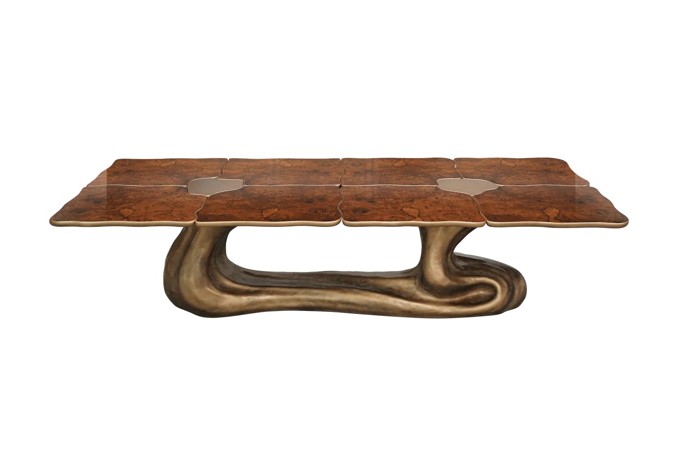 Этот замечательный стол имеет скульптурное основание, которое привлекает внимание своей динамичной формой и безупречными деталями. Изготовленное из стекловолокна и отделанное в эксклюзивном цвете Brass Color от Karpa, основание излучает ощущение роскоши и изысканности. Верхняя часть из корня ореха, изготовленная из отдельных секций, добавляет столу нотку естественной красоты и тепла. Каждая секция столешницы демонстрирует уникальные узоры и зерна орехового дерева, создавая захватывающий визуальный образ. Обеденный стол Sigma является истинным свидетельством слияния искусства и функциональности, делая смелое заявление в любом обеденном пространстве.