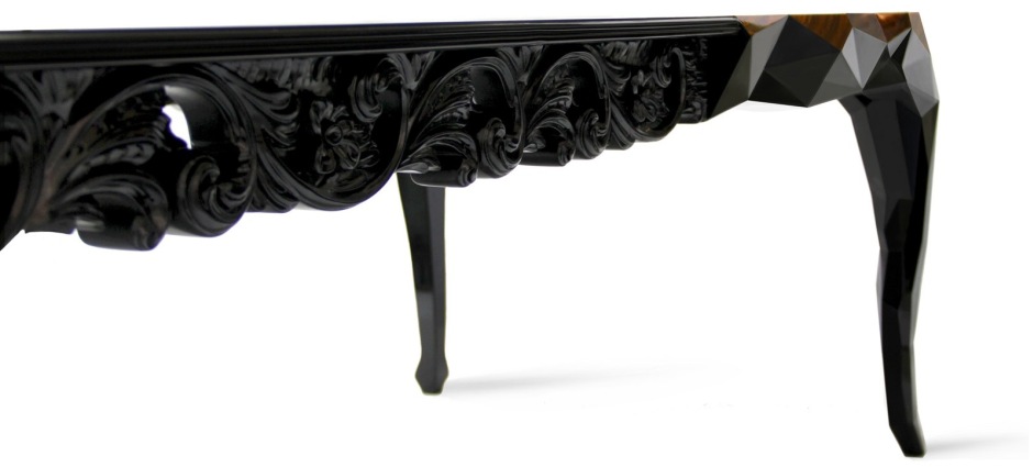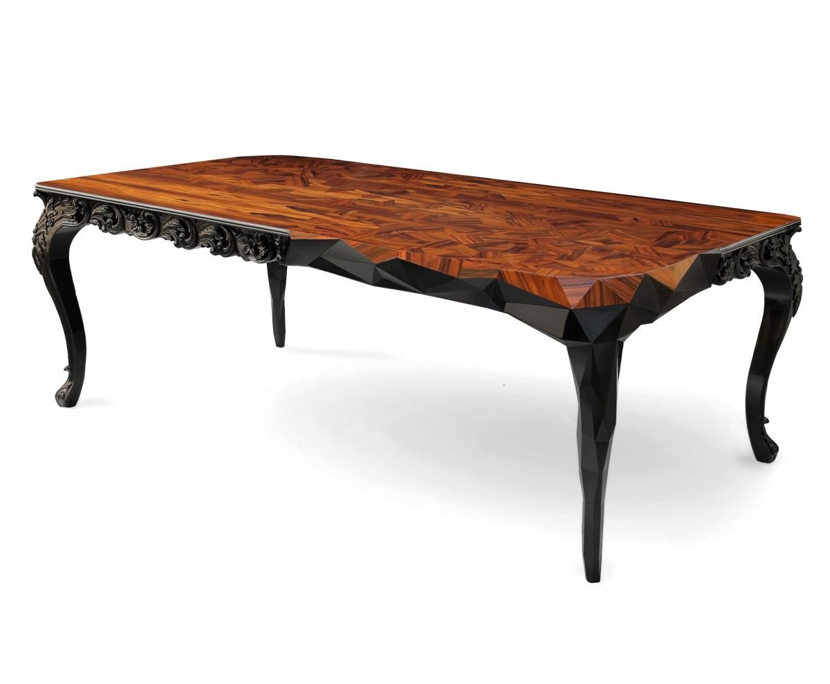 Обеденный стол Royal является серьезным шагом вперед для его создателей –португальского бренда Boca do Lobo. Мастера-краснодеревщики создают каждый экземпляр мебели Boca do Lobo вручную, и стол Royal не стал исключением. Сложная мозаика из палисандрового шпона, украшающая его столешницу, и другие элементы отделки выполнены профессионалами своего дела с высочайшей точностью. Резные ножки этого стола, как и столешница, сделаны из массива дерева и покрыты глянцевым лаком. Этот уникальный предмет мебели сочетает в себе последние тенденции современного дизайна и архитектуры, но при этом не забывает традиций прошлого. Двойственная сущность прекрасно сочетает в себе черты стиля барокко и прямые линии, присущие минимализму, и при этом отражает основу философии Boca do Lobo – постигать будущее по средствам опыта прошлого.