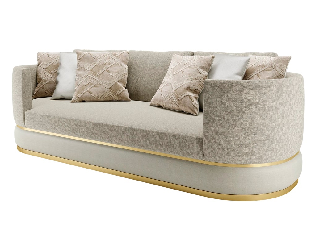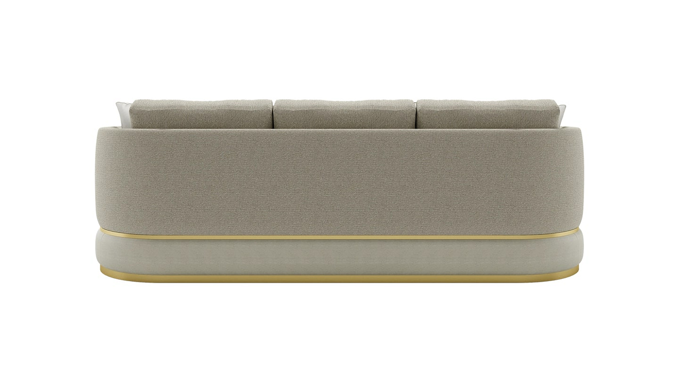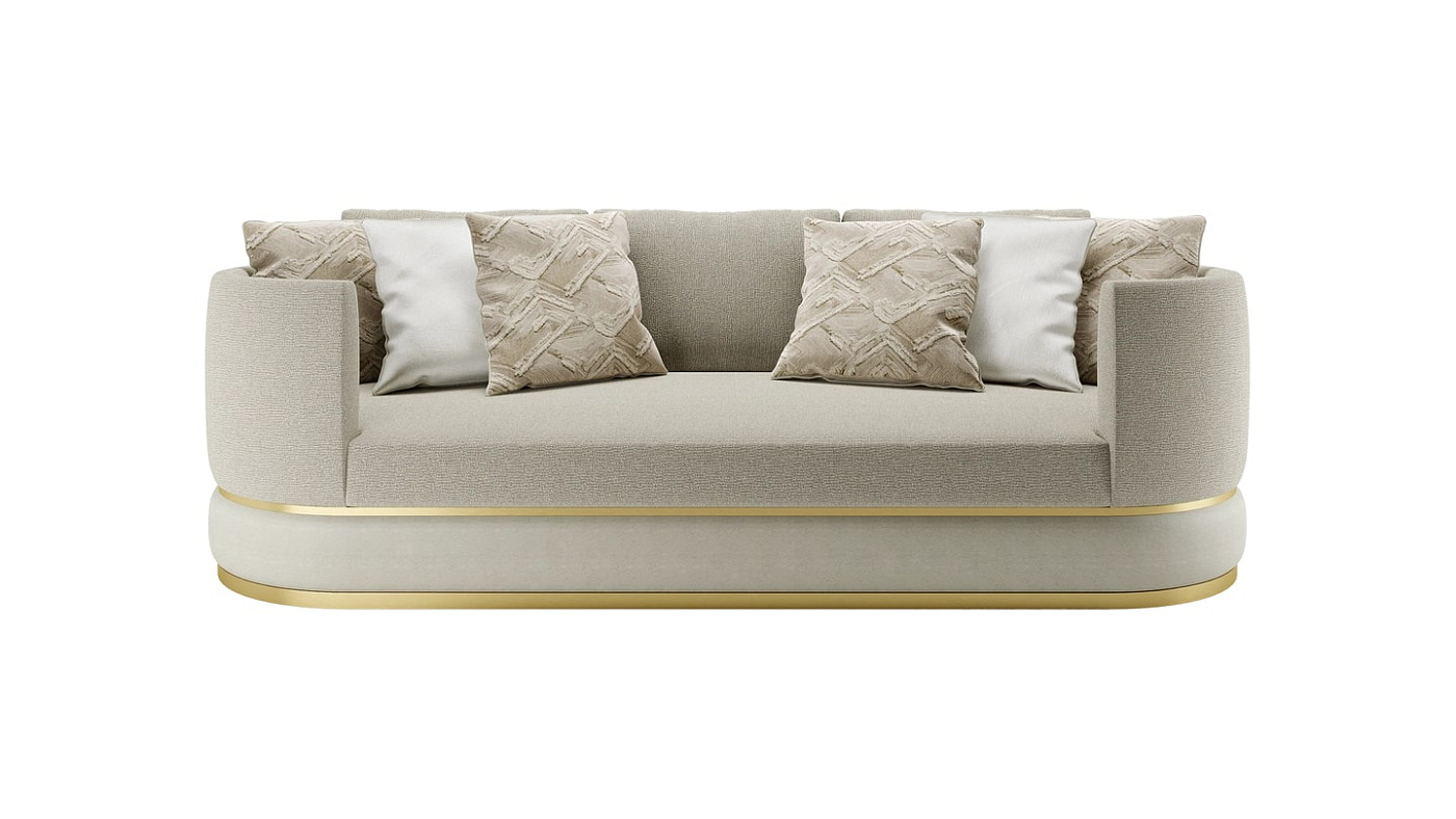Диван AREZZO, отличающийся основанием с полосой контрастной ткани, вставленной между двумя полосками матовой латуни, с мягкими подлокотниками и обитый пышным бархатом, окутывает сидящего, обеспечивая непревзойденный комфорт.