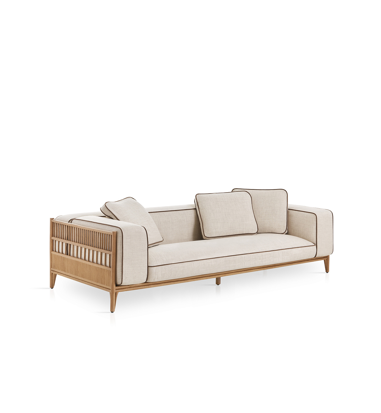 Диван с каркасом из очищенного и тонированного натурального ротанга диаметром 32 мм/1,26 дюйма. Спинка и боковины изготовлены из очищенного и тонированного натурального ротанга диаметром 10 мм/0,4 дюйма. Отделка трехступенчатым покрытием на водной основе (краска, базовый слой и верхний слой), обладающим высокой устойчивостью к солнечному излучению благодаря УФ-фильтрам. Возможность персонализации с помощью широкого ассортимента тканей. Защитные колпачки.