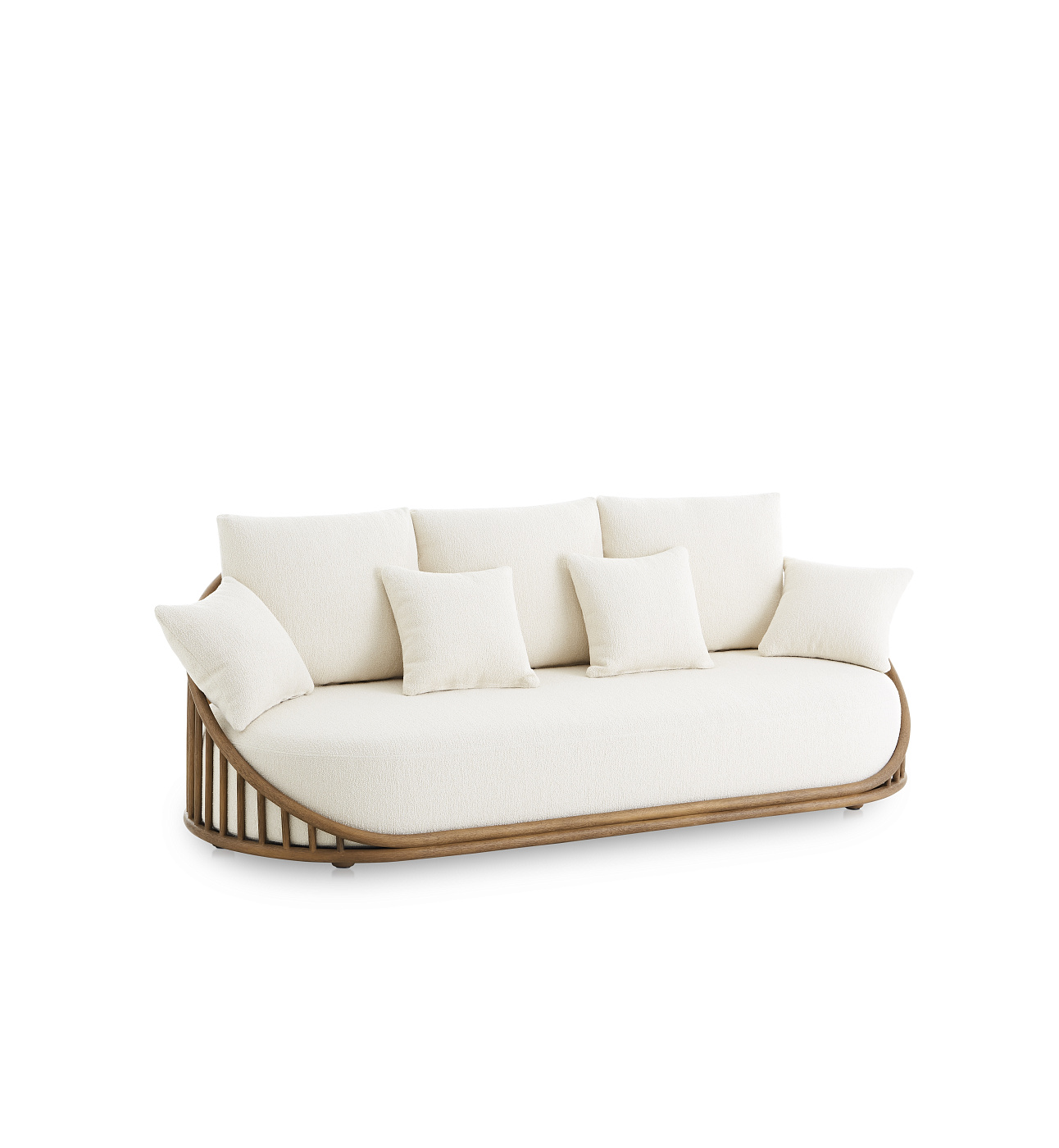 Диван с каркасом из очищенного и тонированного натурального ротанга диаметром 34 мм/1,34 дюйма. Спинка изготовлена из очищенного и тонированного натурального ротанга диаметром 20 мм/0,79 дюйма. Отделка трехступенчатым покрытием на водной основе (краска, базовый слой и верхний слой), обладающим высокой устойчивостью к солнечному излучению благодаря УФ-фильтрам. Возможность персонализации с помощью широкого ассортимента высококачественных технических тканей. Защитные колпачки со съемными вставками из пластикового войлока. В комплект входят 4 свободные подушки 45×45 см/17,75”x 17,75”.