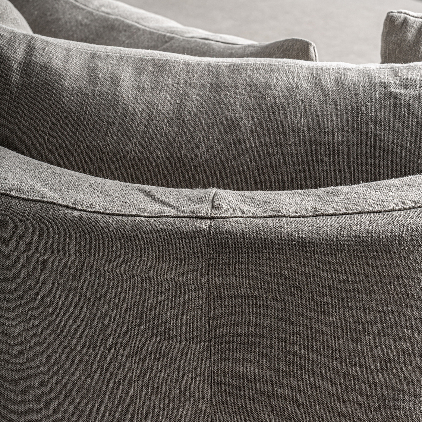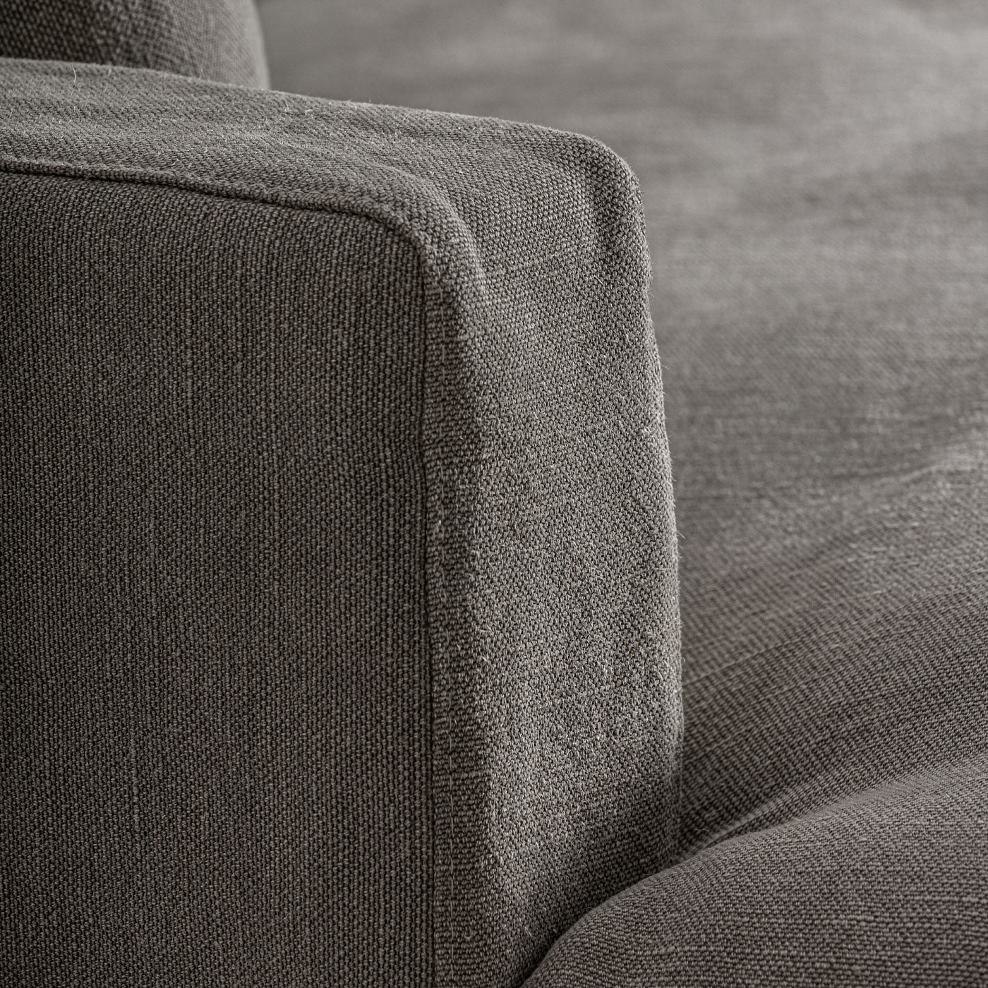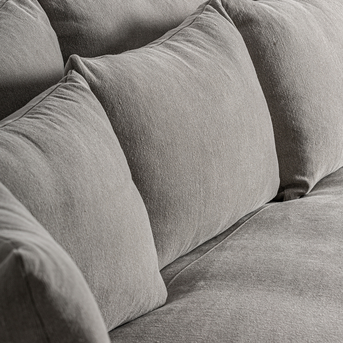 Диван Corbun в классическом стиле, выполнен из льна цвета тауп в сочетании с хлопком и поролоном. Чехол съёмный, складной. Ширина: 250 см, Глубина: 174 см, Высота: 91 см