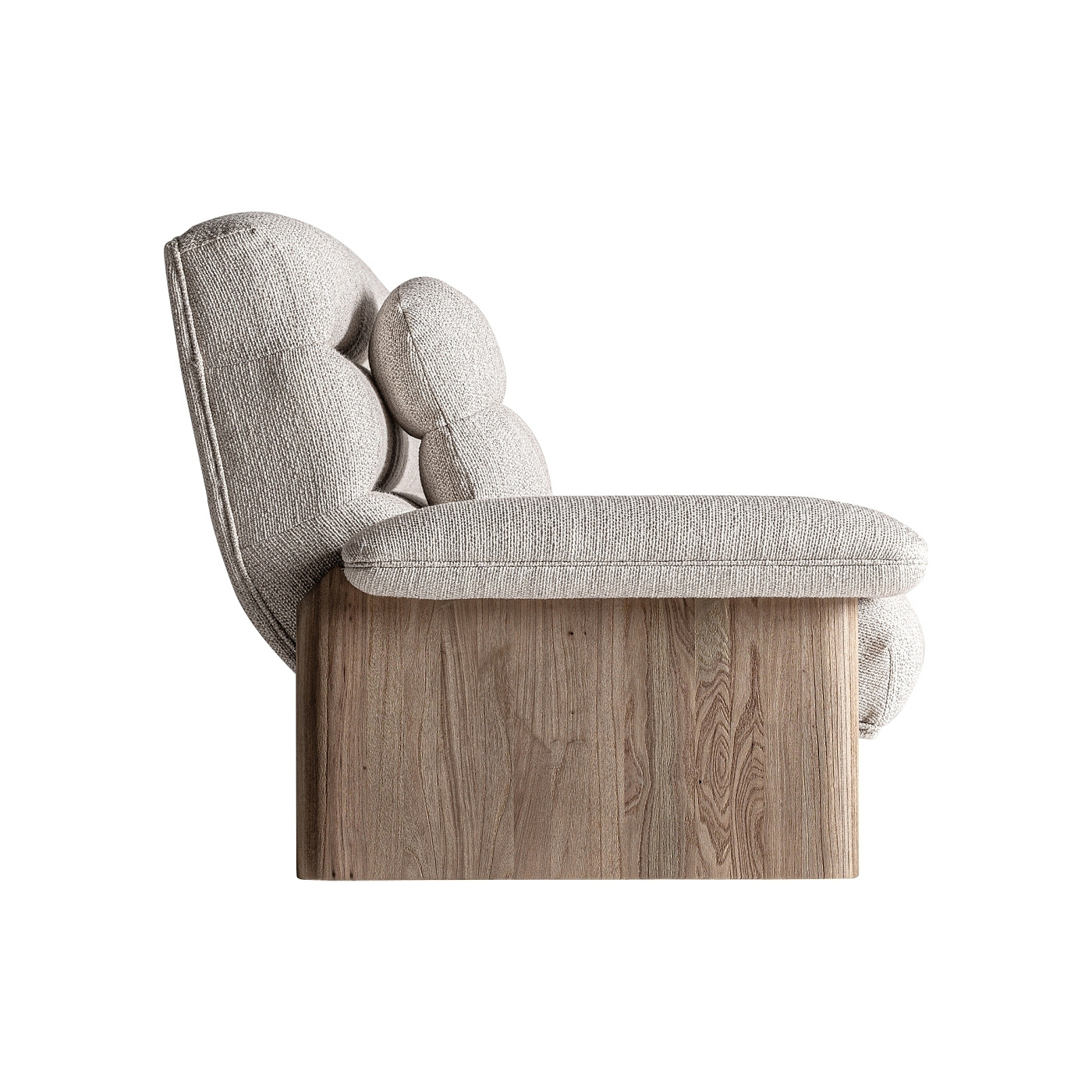 Современный диван. Изготовлен из коричневого дуба в сочетании с бежевым полиэстером.