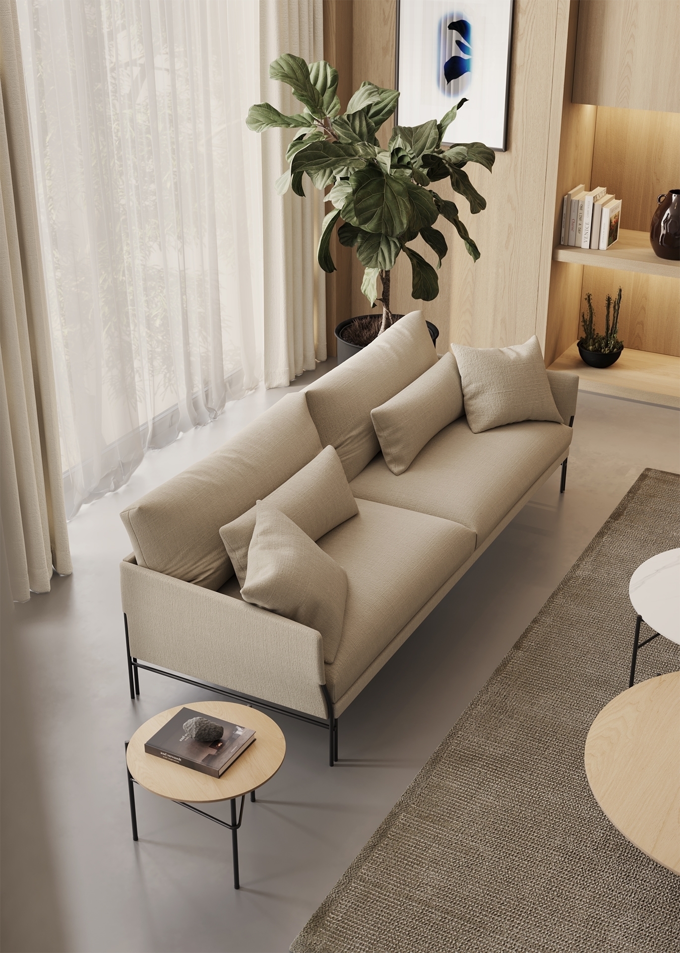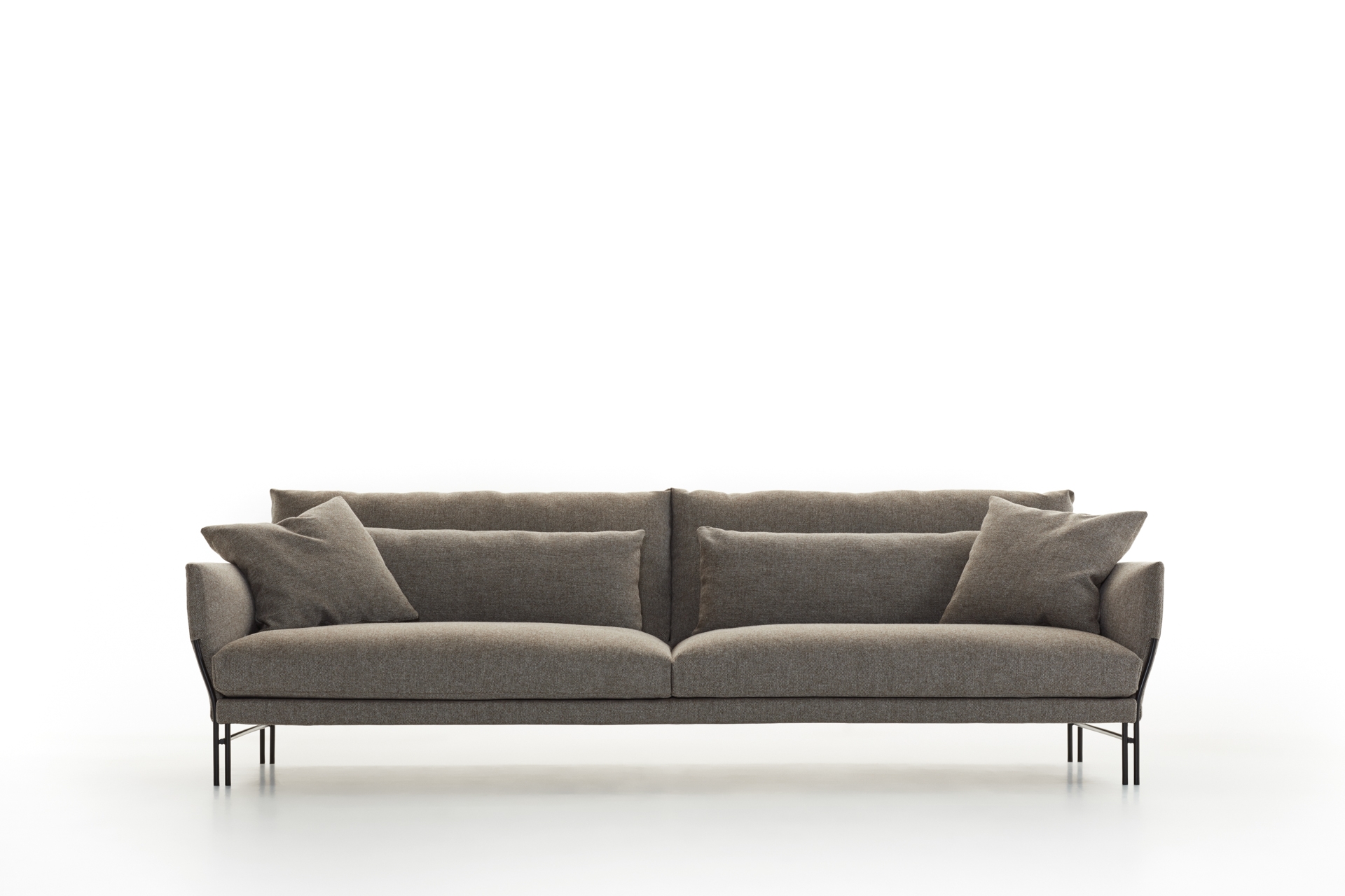 Величественный, сочетает в себе комфорт и легкость, основанный на мягком корпусе, который уравновешивает прямые и извилистые линии, и приглашает вас насладиться моментом близости, отдыха или дружеской беседы в обстановке, которая источает изысканность и очарование. Две функции, позволяющие ему естественным образом вписаться в любой дом или общественное пространство. Этот диван сочетает в себе элегантные, чистые линии с комфортом, обеспечиваемым толстой и мягкой зоной отдыха, качества, которые также передает спинка дивана. С эстетической точки зрения одной из его наиболее отличительных особенностей является видимое основание, состоящее из двойной системы ножек, которая подчеркивает легкость и прочность конструкции.